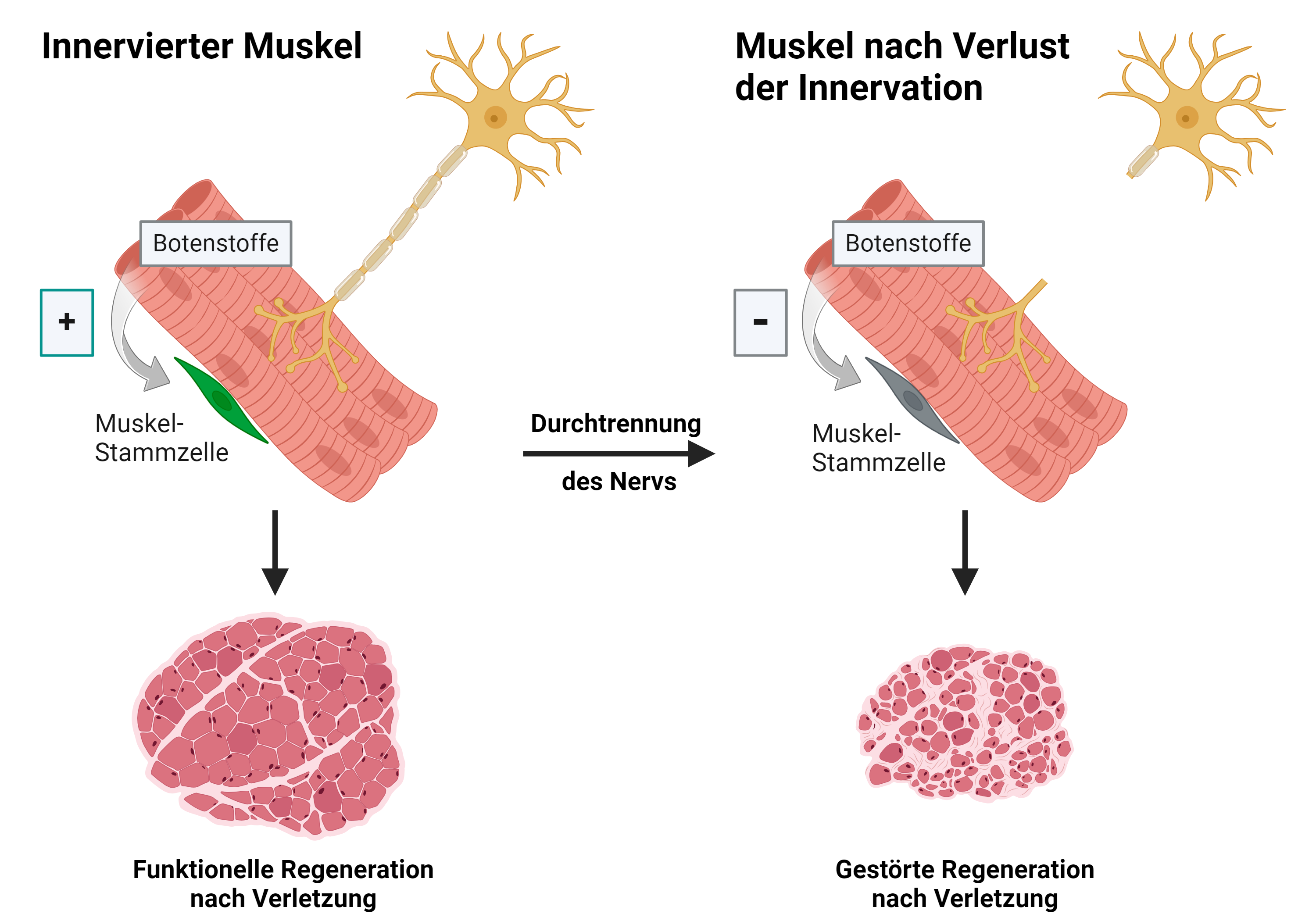 Die Untersuchungen haben gezeigt, dass sich bei einer Unterbrechung der Nervenverbindungen zu den Muskeln vor allem die Muskelfasern verändern, welche einen wichtigen Bestandteil der Nische der Muskelstammzellen darstellen. Durch den Verlust der Nervenverbindungen ändert sich die Zusammensetzung der von den Muskelfasern abgegebenen Signalmoleküle, wodurch die Funktionalität der Stammzellen im Skelettmuskel beeinträchtigt wird. Da Muskelstammzellen für die Regeneration nach Verletzungen unerlässlich sind, führt die Störung der Muskelstammzellen zu einer verminderten Reparatur des geschädigten Muskels. Darüber hinaus dokumentierte das Forscherteam um Julia von Maltzahn, dass der Verlust der Nervenversorgung auch die Integrität der Muskelfasern selbst beeinflusst. Die Erstautorin Henriette Henze fasst die Ergebnisse so zusammen: “Zunächst verändern sich die Muskelfasern in Architektur und Verhalten, wodurch sie bestimmte Substanzen aussenden, welche wiederum die Eigenschaften und damit die Aktivität der Stammzellen beeinflussen.”