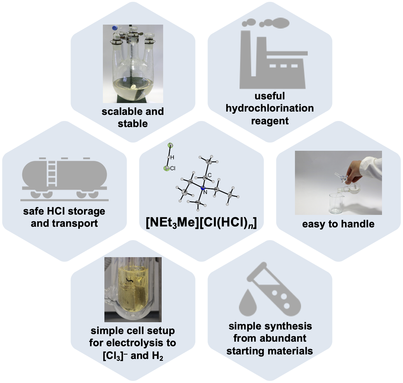 Wissenschaftlerinnen und Wissenschaftler der Freien Universität Berlin um den Chemiker Prof. Dr. Sebastian Hasenstab-Riedel haben in Zusammenarbeit mit Partnern der Technischen Universität Berlin einen sicheren HCl-Speicher in Form einer Ionischen Flüssigkeit entwickelt, der eine vereinfachte Handhabung von wasserfreier HCl ermöglicht. Das HCl-Gas kann als „Bichlorid“ sicher und drucklos gebunden, aber auch wieder freigesetzt werden, um einen sichereren Transport oder eine Speicherung zu gewährleisten. Auch bei der direkten Elektrolyse des Bichlorids zu Wasserstoff und Chlor verspricht diese neue Technologie energieeffizienter als herkömmliche Systeme zu sein. Des Weiteren kann das Bichlorid auch direkt zur Synthese von weiteren Grundchemikalien verwendet werden, die man beispielsweise für die Herstellung von Kunstoffen oder Silikonen nutzt.