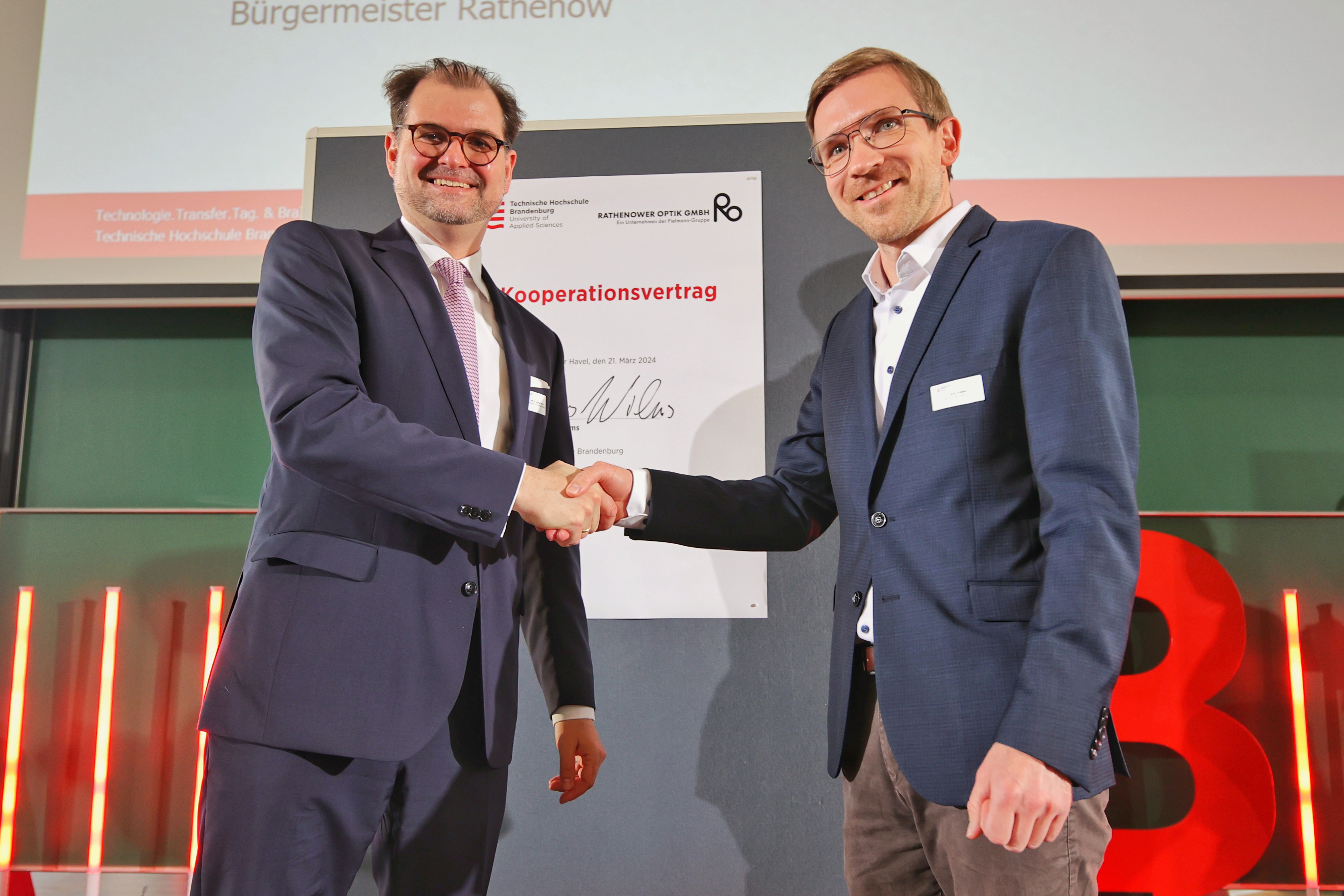 Die Technische Hochschule Brandenburg (THB) und die Rathenower Optik GmbH sind im März eine neue Kooperation eingegangen. Im Rahmen des Technologie.Transfer.Tages. an der THB unterzeichneten THB-Präsident Prof. Dr. Andreas Wilms und Andi Köpke als Geschäftsführer der Rathenower Optik GmbH eine entsprechende Vereinbarung. Demnach wollen beide Seiten in Lehre, Forschung und Technologietransfer fachlich zusammenabreiten und dadurch synergetische Potenziale ausschöpfen.