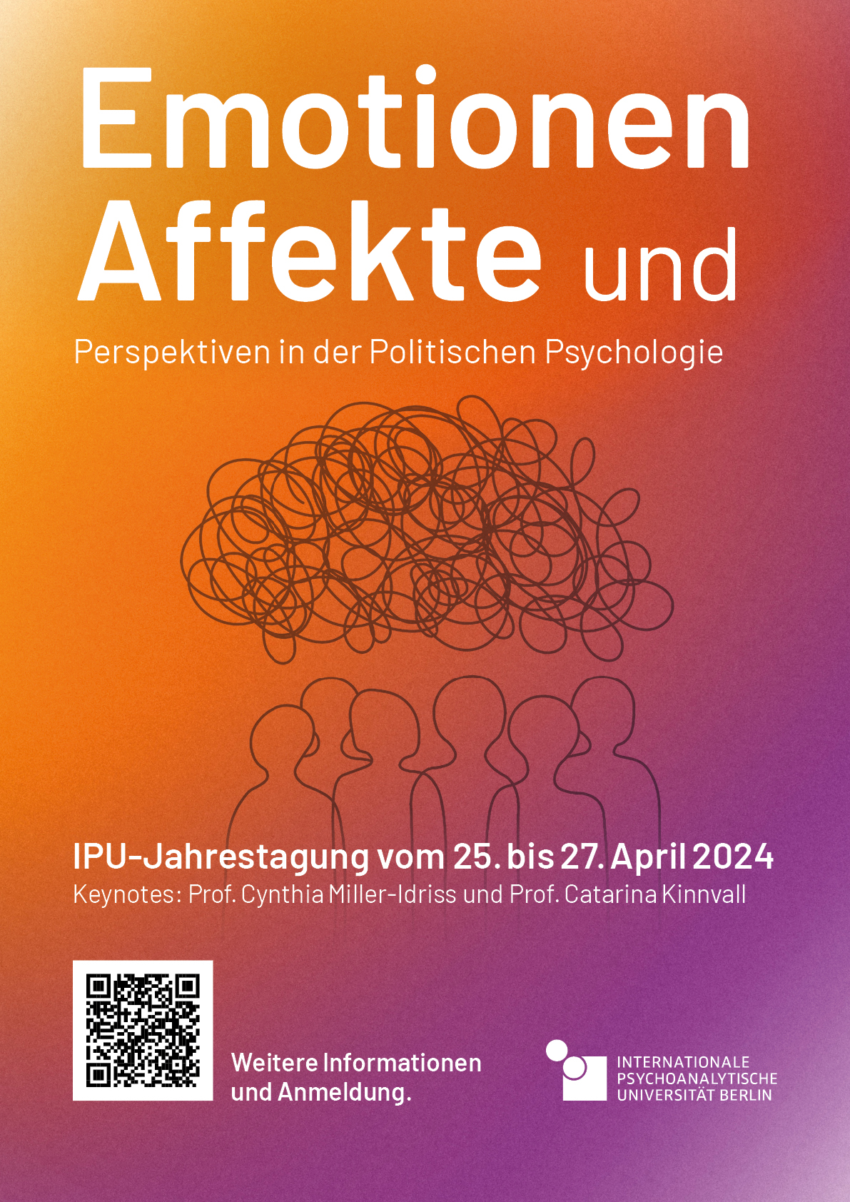 Vom 25. bis 27. April 2024 findet die diesjährige Jahrestagung der Internationalen Psychoanalytischen Universität Berlin statt. Unter dem Titel "Emotionen und Affekte" fokussiert die Tagung dieses Mal auf Perspektiven in der Politischen Psychologie. Speaker:innen sind unter anderem Cynthia Miller-Idriss und Catarina Kinnvall. Organisiert wird die Tagung von den IPU-Professoren Thomas Kühn, Phil C. Langer und Gavin Sullivan.