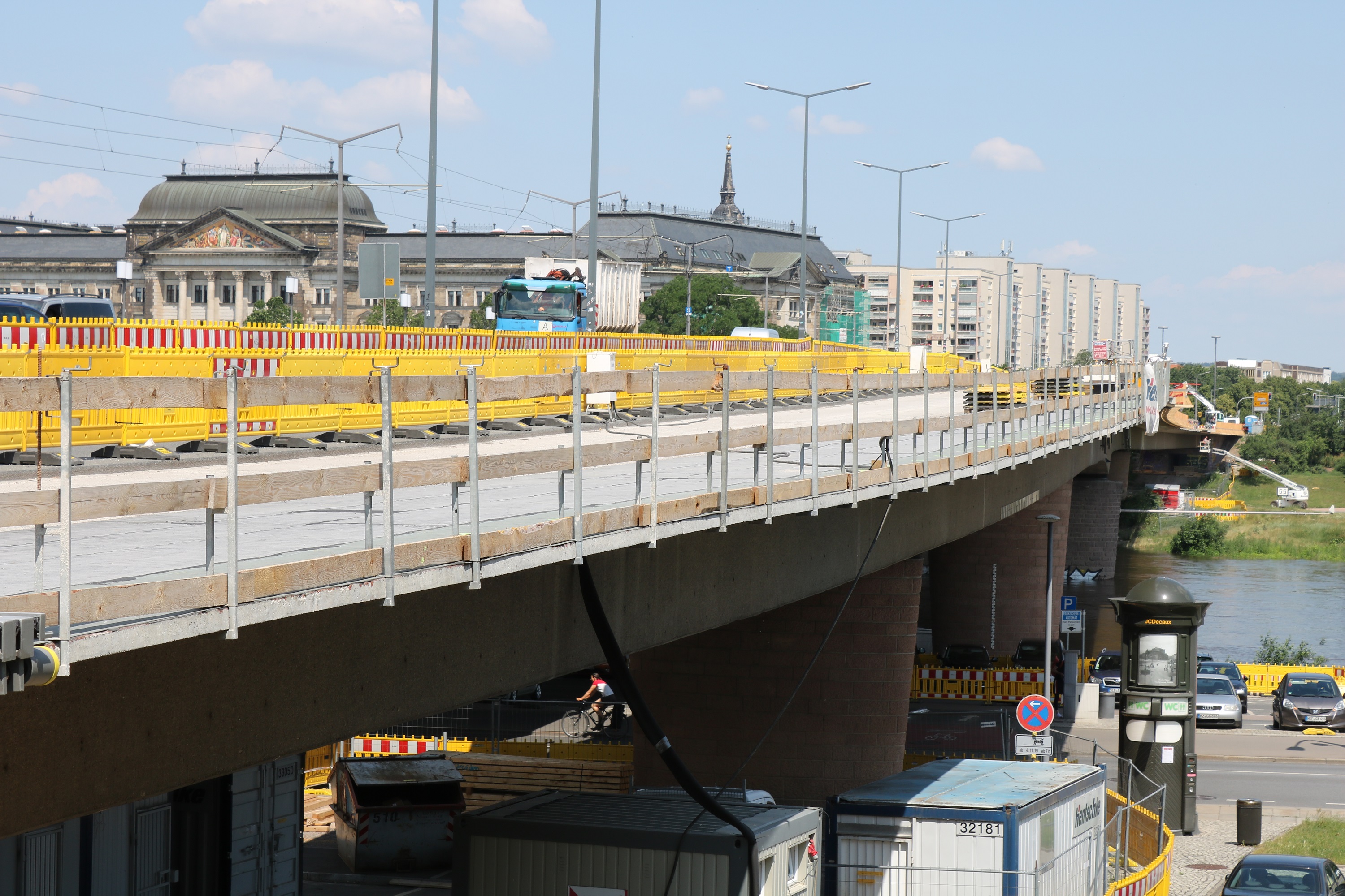Die Neuentwicklung setzte die Deutsche Basalt Stab GmbH bei der Sanierung der 500 Meter langen Carolabrücke in Dresden in der Praxis um und ersetzte mit ihr die alten Brückenkappen im Bereich des Fuß- und Radweges. Projektleiter Prof. Görtz hofft, dass dieses Beispiel Schule machen wird: „Die Anwendung der nichtmetallischen Bewehrung und des Recyclingbetons ist nicht auf Brückenkappen beschränkt, sondern kann für viele Bereiche eine sinnvolle Alternative sein. Nichtmetallische Bewehrung bietet sich vor allem in korrosiver Umgebung an, z. B. im Bereich von Meerwasser oder dort, wo im Winter mit Tausalz gestreut wird. Recyclingbeton kann für viele Massenbauteile, z. B. konventionelle Deckenplatten im Hochbau, eine ressourcenschonende Alternative sein.“