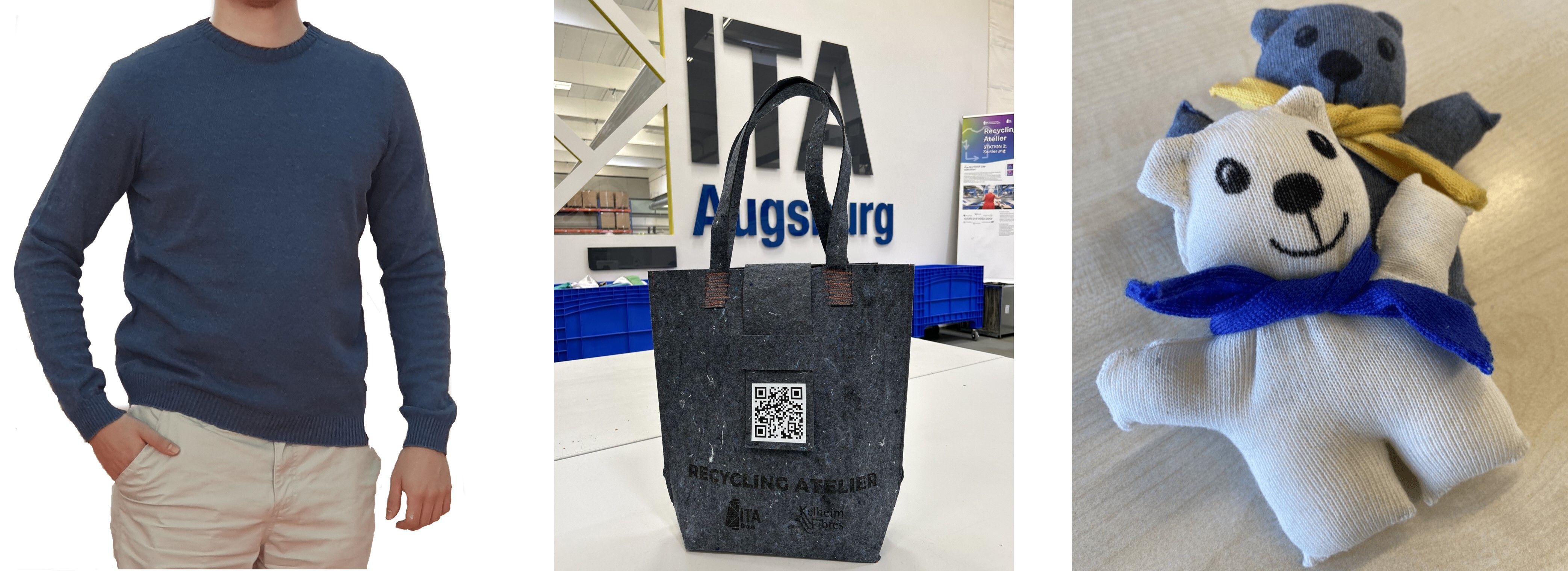 Under the title "Walk4Recycling", the Recycling Atelier now presents products made from post-consumer recycled materials. A new flat-knit jumper, teddy bears and a fleece bag have been produced from used textiles (worn knitwear) with the help of the strong partner network. The ring yarn used for the jumper consists of 65 per cent recycled cotton and 35 per cent new polyester. This high proportion of post-consumer recycled material is an innovation for a ring-spun yarn of this fineness, as today mainly coarse rotor yarns for lower-quality textiles are spun from these materials. The dyeing and decolouring process, which is essential for the fashionable reuse of textiles, is demonstrated using the teddy bear as an example. The non-woven bag shows the potential to close further circles. The fibre remnants from the ring yarn production of the jumper and teddy were collected for this purpose. The fibre remnants were processed with regranulated LooPET fibres to create a nonwoven fabric. This gives the cotton fibres a further life cycle.
