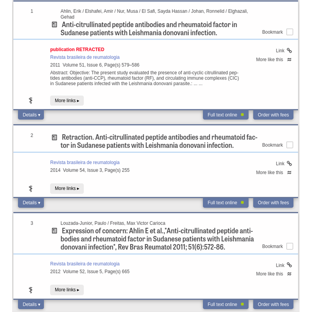 Um eine Weiterverbreitung der Fehler zu vermeiden, sollten zurückgezogene Artikel nicht zitiert werden. Wie lässt sich das zuverlässig vermeiden? Hier setzt das neue Feature von LIVIVO an. Die Retractions werden so markiert, dass sie bei der Auswahl der verwendeten Publikationen in einer Recherche deutlich erkennbar sind. Die offizielle Meldung der Retraction und falls vorhanden der "Letter of concern" sind verlinkt. Dies trägt bei zu mehr Transparenz in der Forschung und beugt der Verbreitung falscher Forschungsergebnisse vor.