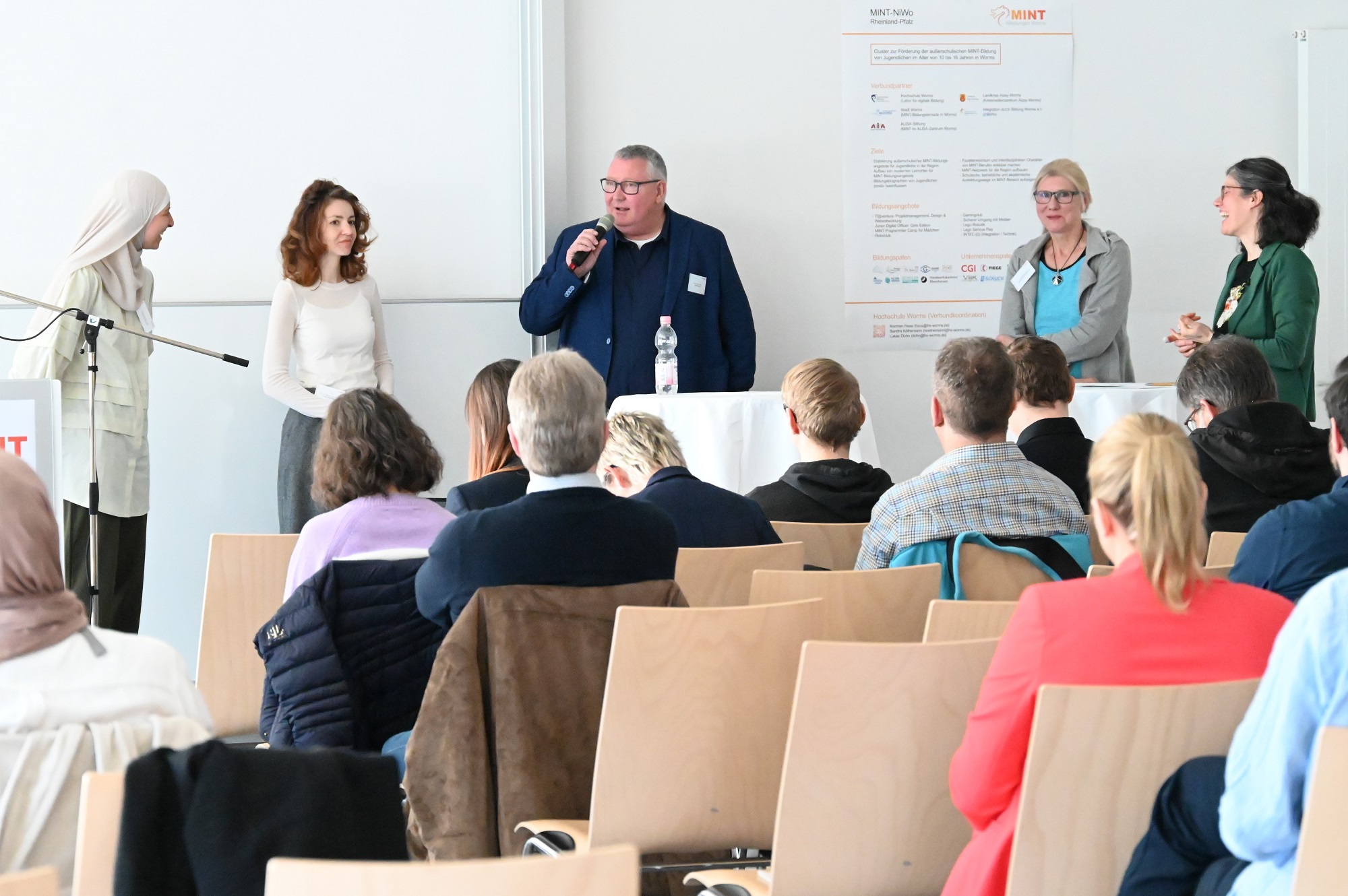 In dem darauffolgenden Podiumsgespräch beleuchteten Waldemar Herder, Bildungsdezernent der Stadt Worms; Prof. Dr. Marie-Luise Sessler, MINT-Beauftragte der Hochschule Worms; Dr. Sibylle Reuter, MINT-Verantwortliche an der Pfrimmtal Realschule Plus; sowie Ikhlas Chekaik Chaila, Vorsitzende des Jugendparlaments der Stadt Worms, ihre Erfahrungen im Bereich der MINT-Strategien, wobei sie sich insbesondere den Herausforderungen und Wegen widmeten.