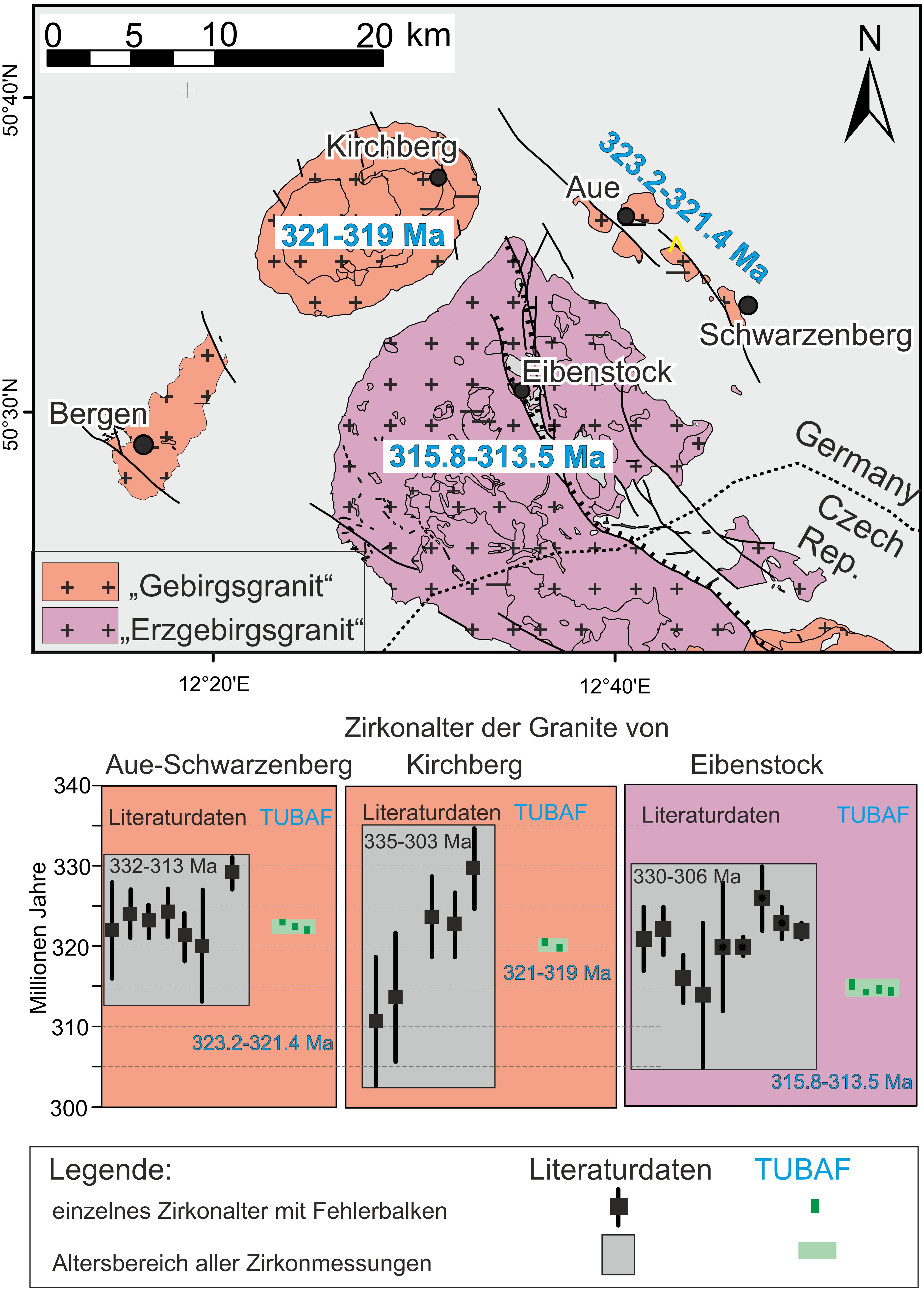 Die Uran-Blei-Datierung aus dem Freiberger Isotopenlabor lieferte hinsichtlich der Erzbildung im Erzgebirge schon jetzt neue Erkenntnisse. „Wir konnten zeigen, dass die benachbarten großen Granitkörper des Westerzgebirges nicht wie vermutet gleichalt sind. Hingegen bildeten sich zuerst die Granite von Aue-Schwarzenberg (vor rund 323 – 321 Millionen Jahren), worauf zirka zwei Millionen Jahre später (vor 321 bis 319 Millionen Jahren) der Kirchberger Granit intrudierte. Noch einmal gut fünf Millionen Jahre später (vor 316 bis 314 Millionen Jahren) erstarrte dann das Magma des Eibenstocker Granits.“