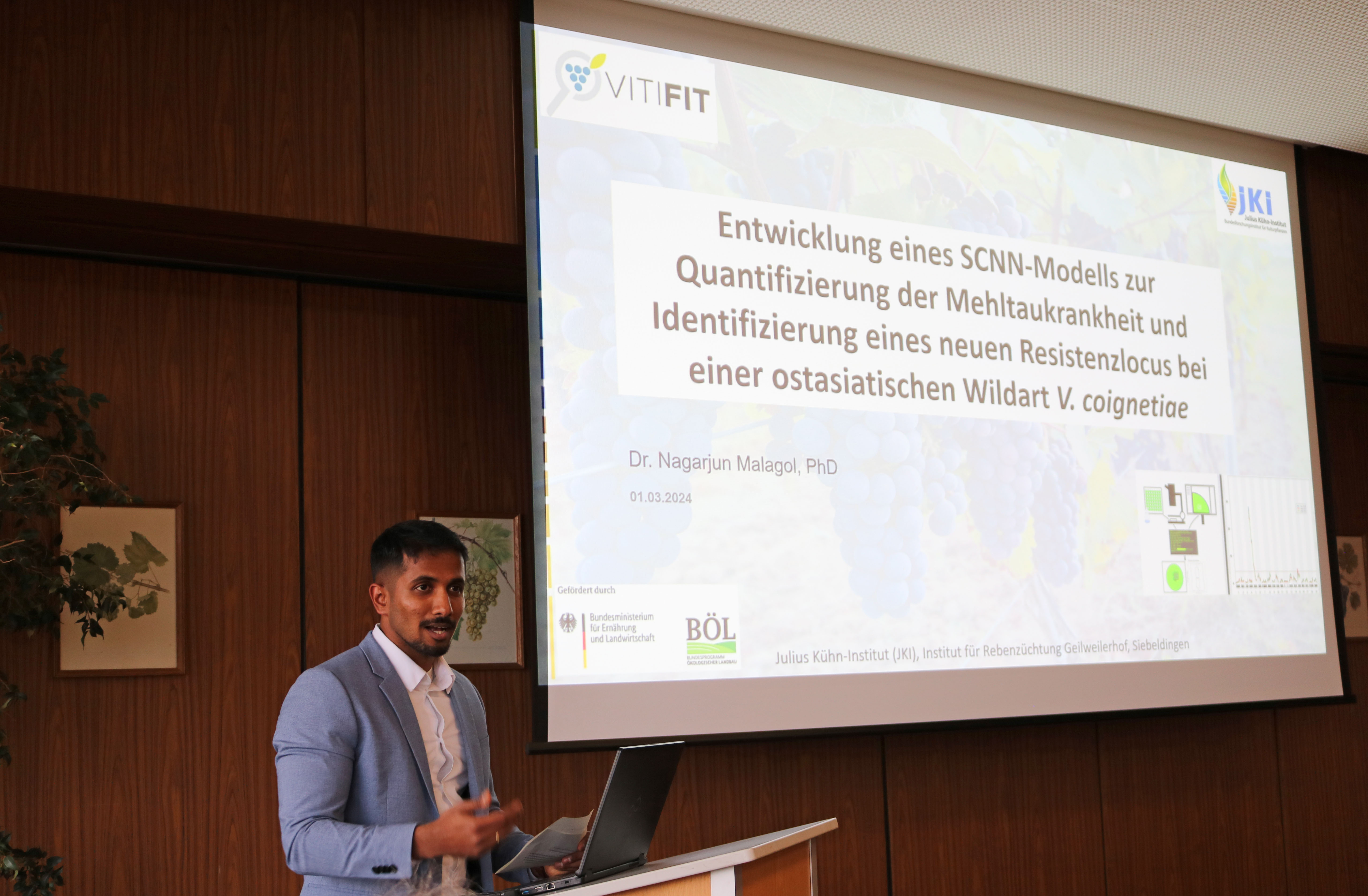 (Siebeldingen) Dr. Nagarjun Malagol erhielt für seine wissenschaftliche Leistung im Bereich der Rebenzüchtung den Peter Morio-Preis. Mit seiner Promotionsarbeit gelang es dem Wissenschaftler des Julius Kühn-Instituts (JKI) einen neuen Resistenzlocus (Rpv32, Chromosom 14) gegen den Pilzerreger des Falschen Mehltaus in der ostasiatischen Wildrebe Vitis coignetiae zu identifizieren. Diese Wildart ist als Zierrebe bekannt, die vor allem in den pfälzischen Weinorten die Straßen ziert.