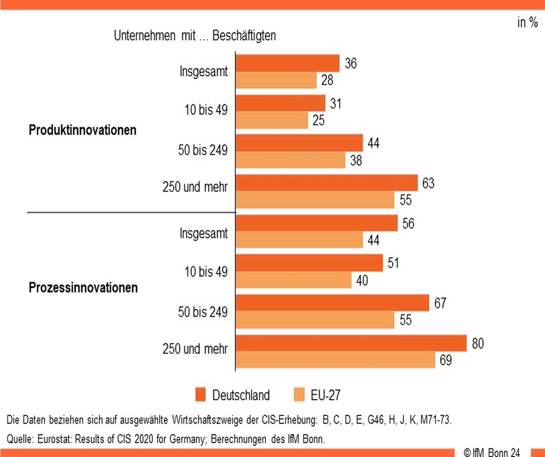 Die Wissenschaftlerinnen und Wissenschaftler des IfM Bonn berechnen regelmäßig auf Basis des Community Innovation Surveys (CIS) die Innovationsaktivitäten sowohl für die größeren als auch für die kleinen und mittleren Unternehmen. Ein Unternehmen wird dann als innovativ bezeichnet, wenn es innerhalb eines zurückliegenden Dreijahreszeitraum eine Produkt- oder Prozessinnovation eingeführt hat.
