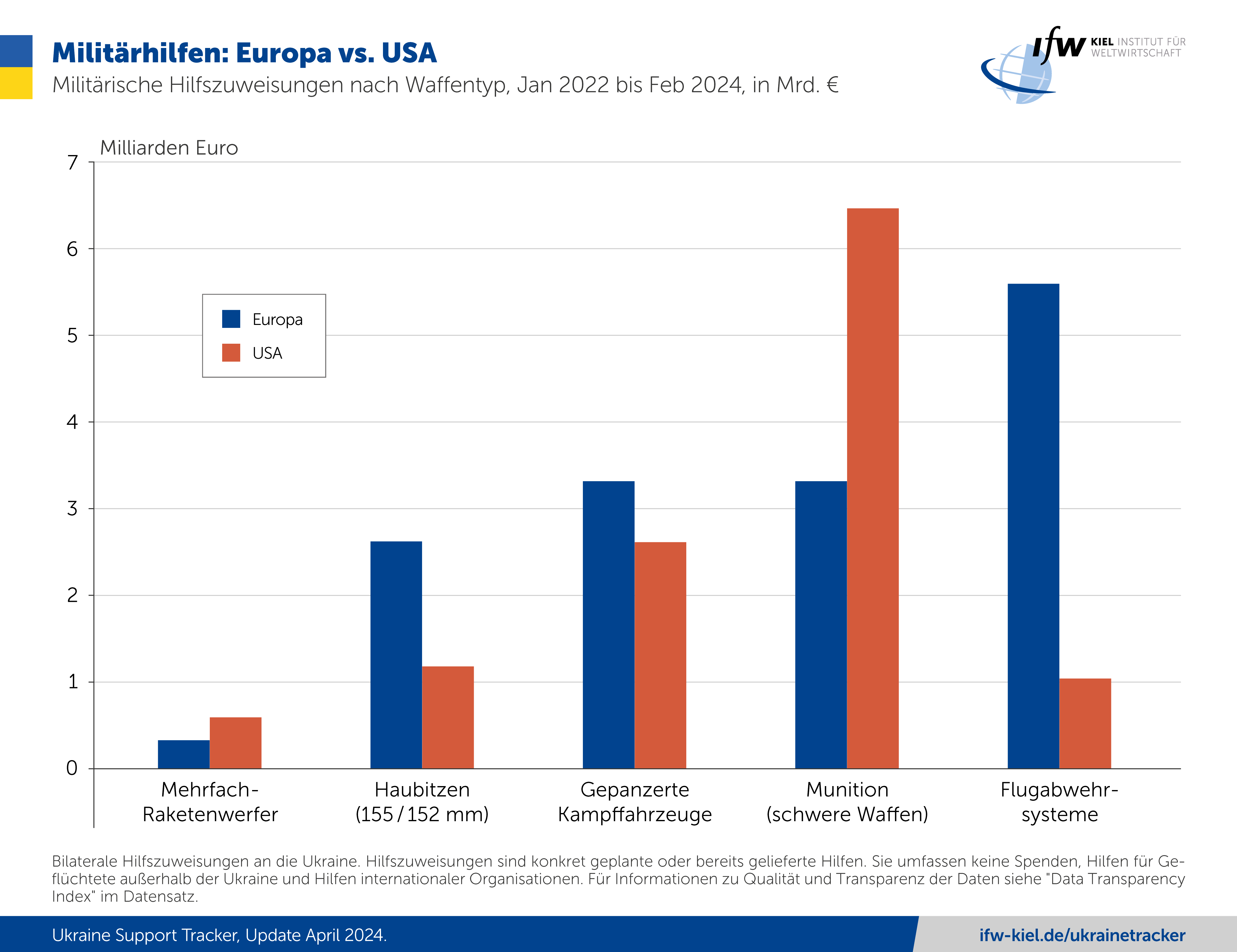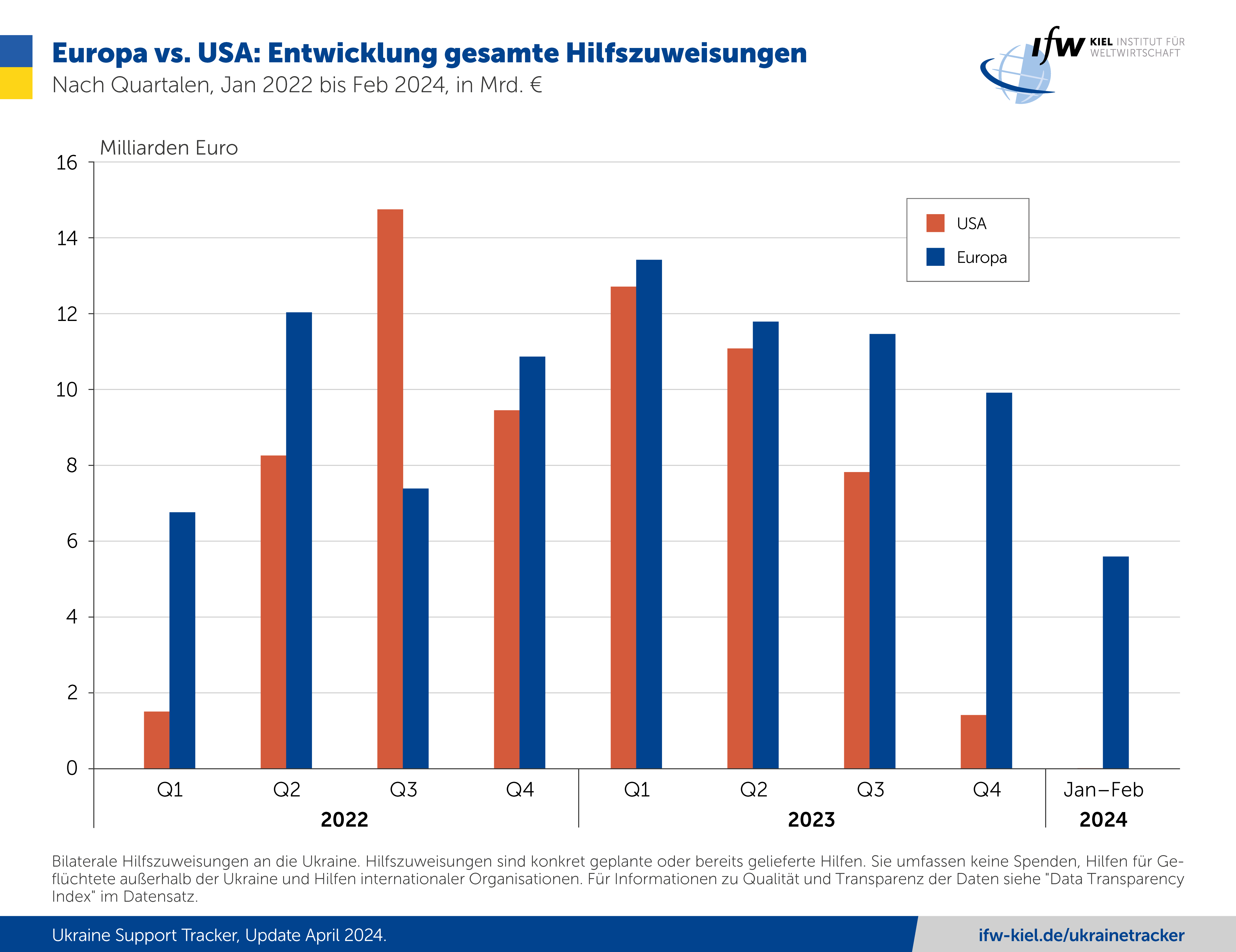 Stand 29. Februar haben die europäischen Geber und die EU seit der Invasion Russlands in der Ukraine vor 2 Jahren Gesamthilfen von 89,9 Mrd. Euro für militärische, humanitäre und finanzielle Unterstützung zugewiesen. Die USA kommen auf 67 Mrd. Euro. Seit Sommer 2023 liegen die Hilfszuweisungen Europas durchweg über denen der USA, da der US-Kongress seit über einem Jahr keine neuen Ukraine-Hilfen gebilligt hatte.
