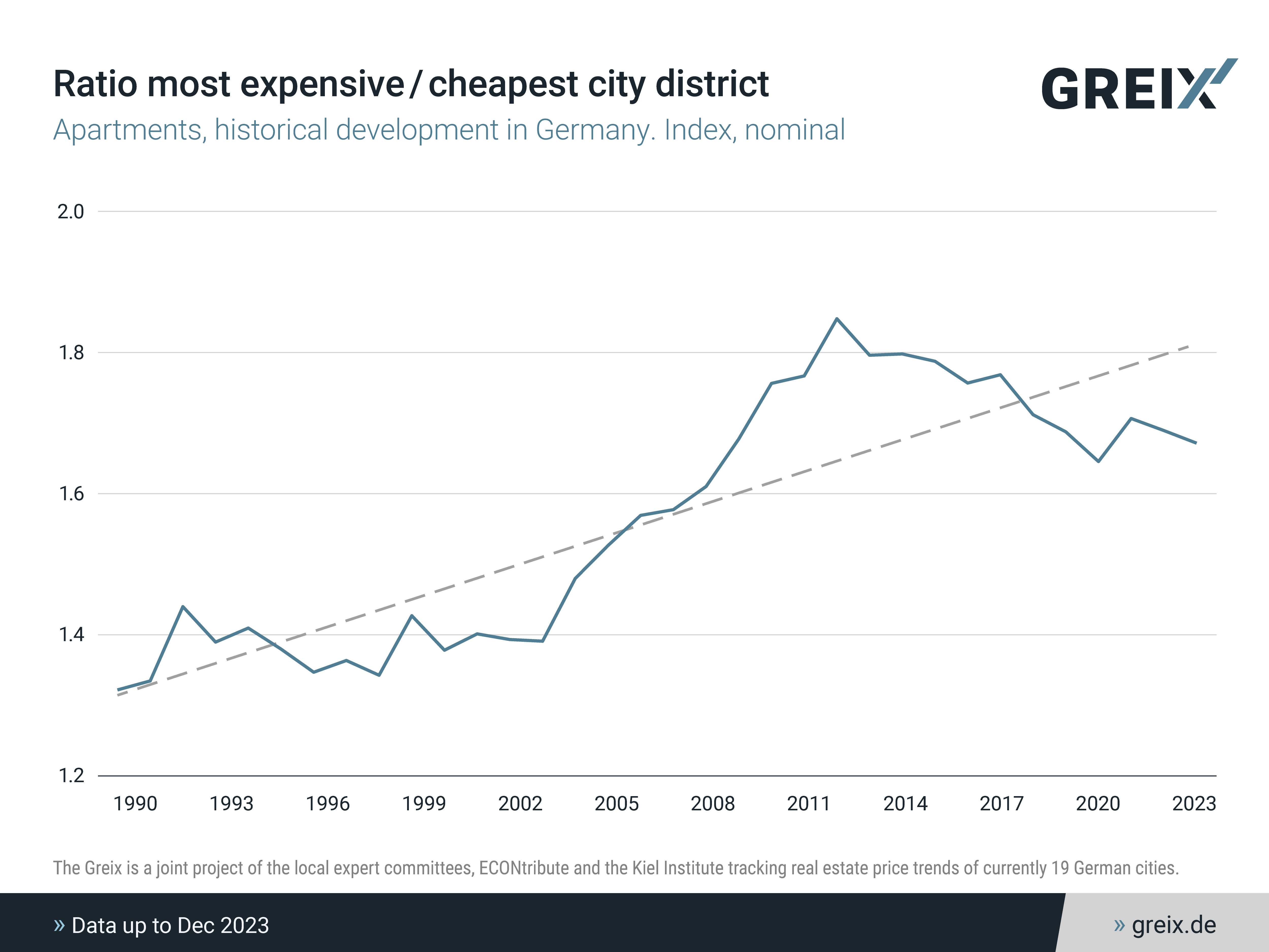 In the 1990s, the price per square meter in the most expensive district of a city was on average around 30 percent higher than in the cheapest. 2023, the price premium was around 70 percent. This means that the price range has more than doubled since the 1990s.