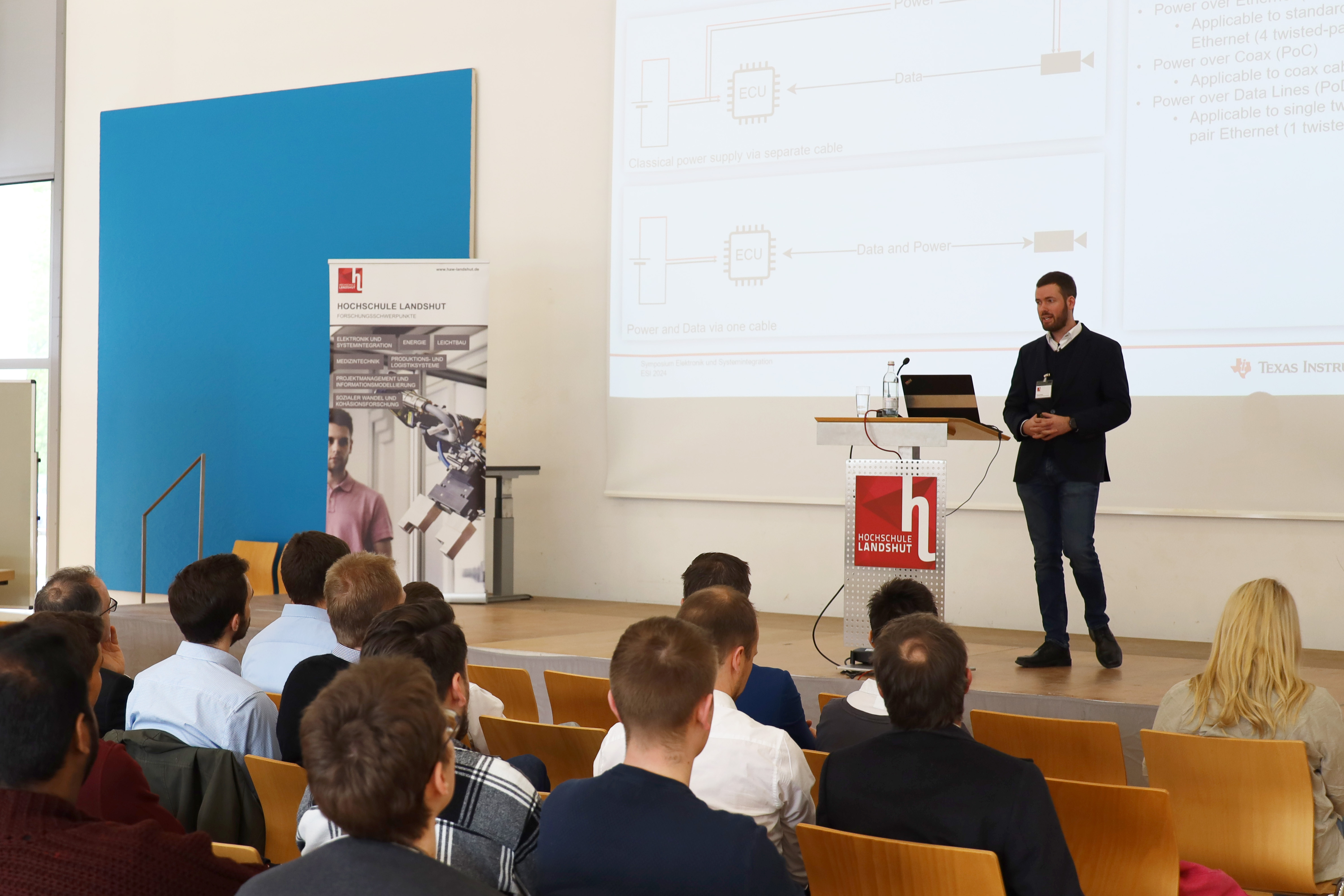An der Hochschule Landshut mit seinem Cluster Mikrosystemtechnik finden seit mittlerweile 15 Jahren Fachveranstaltungen aus dem Bereich Elektronik, Mikrosystemtechnik und Systemintegration statt, ein breites Netzwerk an Experten ist entstanden. Die zahlreichen „Ehemaligen“ der Hochschule Landshut, Absolventinnen und Absolventen die mittlerweile in verschiedenen Unternehmen der Branche tätig sind, tragen zusätzlich zur starken Vernetzung bei. Auch den Plenums-Vortrag des Fachforums hielt ein solcher Alumnus: Fabian Barth, System Engineer bei der Texas Instruments Deutschland GmbH, sprach zum Thema „Power over Data Lines (PodL) für Automotive Ethernet“. Für fortschrittliche Fahrzeugarchitekturen mit hohen Datenmengen, die in Hochgeschwindigkeit übertragen werden müssen, biete die Integration von PodL, die parallele Übertragung von Strom im Datenkabel, erhebliche Vorteile bei der Integration von elektronischen Komponenten und Sensoren; dies in Bezug auf Kosten, Effizienz und Leichtbau. Wichtig sei dabei, die Auswahl des passenden Filternetzwerks (CDN). PoDL bieten für Barth eine maßgeschneiderte, effiziente Lösung, die kostengünstig implementiert werden kann.