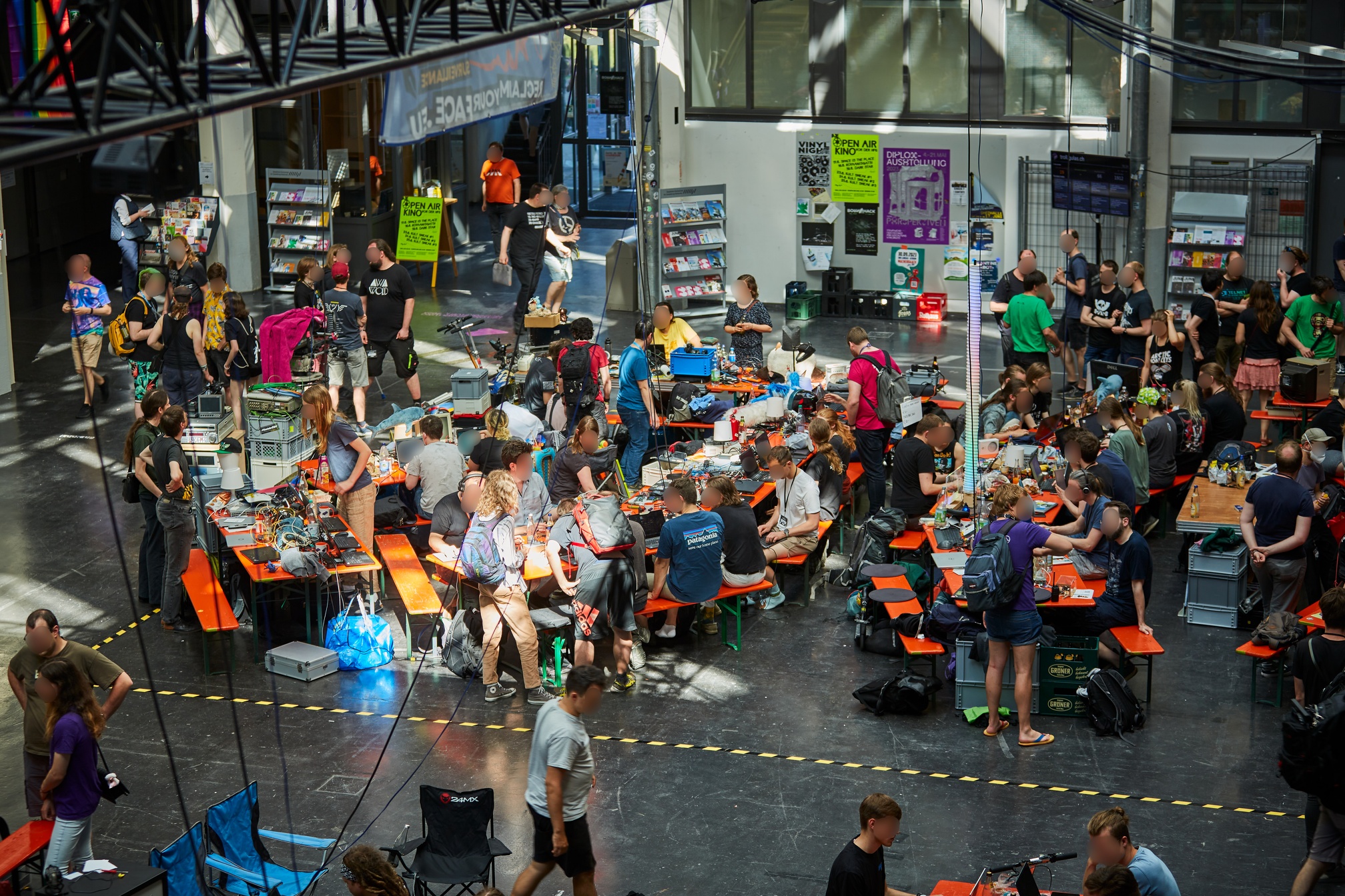 Das Programmieren steht im Zentrum der GPN. In den Lichthöfen der HfG stehen dazu im »Hackcenter« Tische mit Strom- und Netzwerkanschluss bereit, an denen die Gäste ihre Zelte aufschlagen können. Ein großer Teil reist mit einem Projekt an, um auf der Gulaschprogrammiernacht ein paar fokussierte Tage und gegebenenfalls auch Nächte damit zu verbringen. Das heißt nicht, dass kein Austausch stattfindet. Im Gegenteil: Die meisten Hackenden, wenn sie nicht gerade in tiefster Programmiermeditation versunken sind, geben gerne Auskunft über ihr Steckenpferd. Auch gerade Fertiggewordenes wird gerne vorgeführt, und so wimmelt es auf der Gulaschprogrammiernacht von selbstgebauten Lichtinstallationen und Gerätschaften.