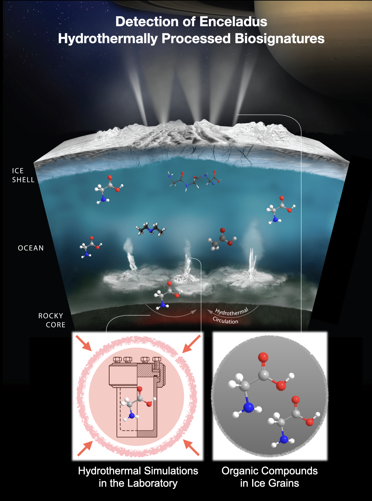 Researchers also suspect there are hydrothermal fields located at the bottom of Enceladus' ocean. It was previously unclear whether the organic molecules discovered were formed in these fields. Khawaja, together with his colleagues Lucia Hortal and Thomas Sullivan, has been searching for a way to answer this question. "To this end, we simulated the parameters of a possible hydrothermal field on Enceladus in the laboratory at the FU Berlin," says Khawaja, who has recently moved from the FU Berlin to the University of Stuttgart. "We then investigated what effects these conditions have on a simple chain of amino acids." Amino acids are the basic building blocks of proteins and the basis of all life as we know it.