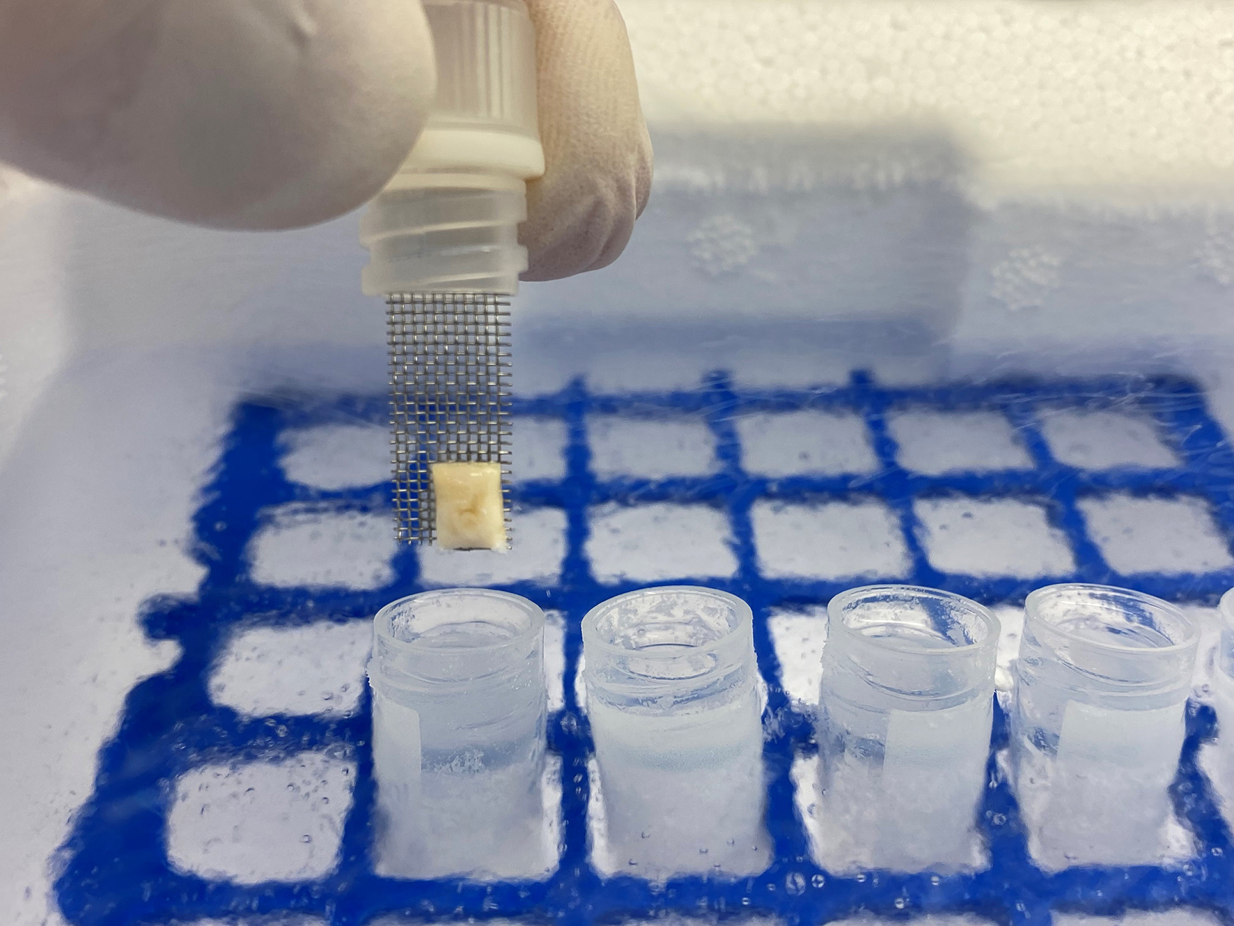 Bei einer schrittweisen Absenkung der Temperatur auf -196°C, lässt sich jedoch die Bildung von Eiskristallen technisch nicht vollständig vermeiden. Dies kann die Unversehrtheit des Gewebes negativ beeinflussen. Werden dagegen Gewebsproben innerhalb von Sekundenbruchteilen tiefgefroren lassen sich Schäden an Zellen vermeiden. „Denn eine Bildung von Eiskristallen ist nicht möglich – die Probe verglast sozusagen“, erklärt Dr. Rebekka Einenkel, Leiterin des Forschungslabors der Gynäkologischen Endokrinologie und Reproduktionsmedizin am UKB. „Bei humanen Embryonen und Eizellen hat sich dieses Verfahren, die sogenannte Vitrifikation, längst durchgesetzt.“