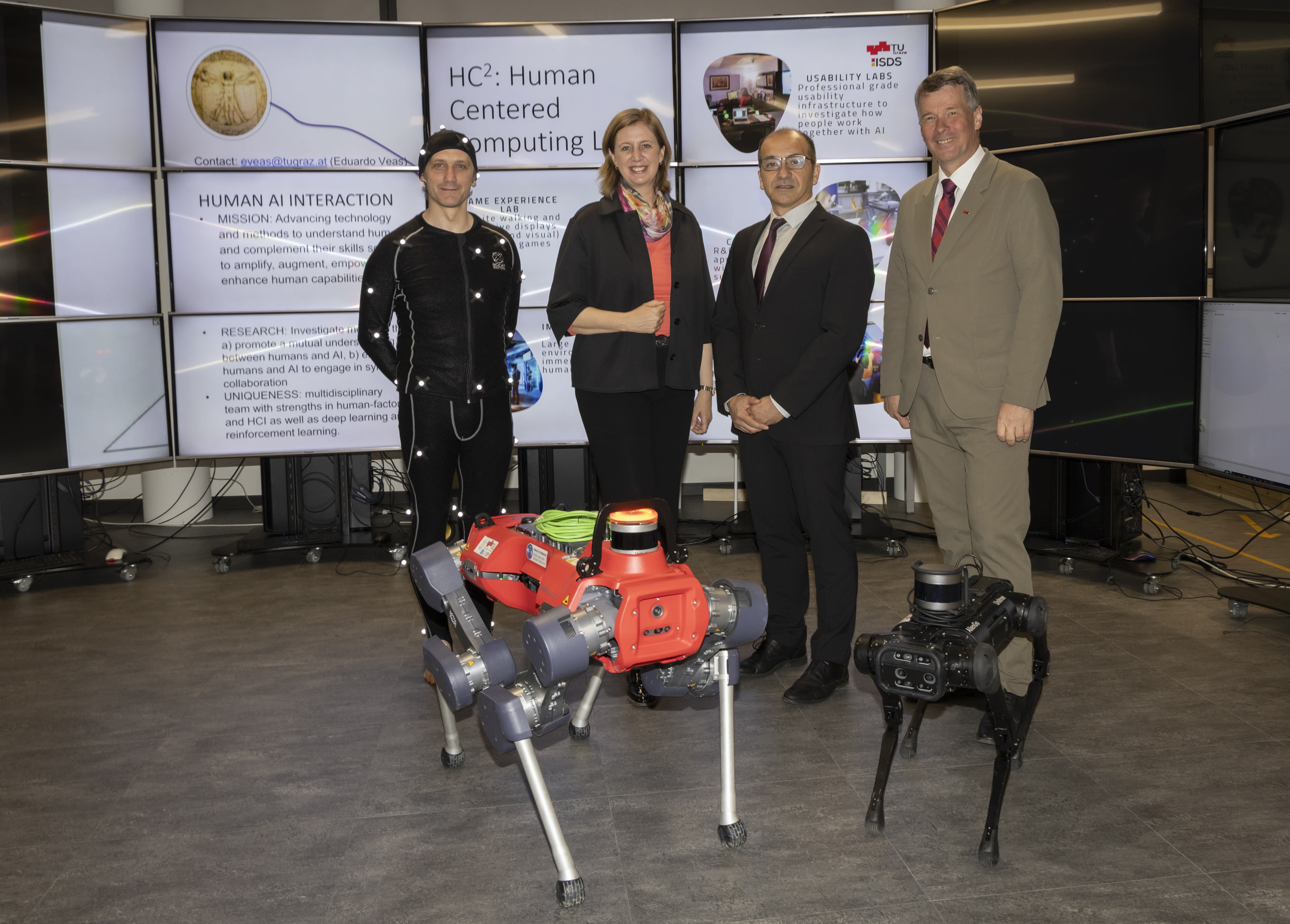 Mit den neu eröffneten Human-Centered Computing (HCC) Labs im Data House am Campus Inffeldgasse steht an der TU Graz nun eine der modernsten Forschungseinrichtungen Europas in diesem Bereich zur Verfügung. Aufgrund der großen Vielfalt an technischer Infrastruktur heben sie sich von anderen Laboren gleicher Bezeichnung deutlich ab. Hier sind zahlreiche Technologien in einem Forschungslabor untergebracht, die sich für die verschränkte Forschung verschiedenster Disziplinen kombinieren lassen, um so etwa autonomes Fahren voranzubringen, Brain-Computer-Interfaces zu verbessern oder virtuelle Welten in höchster Qualität mit Künstlicher Intelligenz und Robotik zu vereinen. So wird beispielsweise die VR-gesteuerte Telepräsenz mittels Robotern in Echtzeit möglich, um aus der Ferne Arbeiten zu erledigen oder gefährliche Gebiete zu erkunden. Gefördert wurde die Einrichtung der HCC Labs durch das Bundesministerium für Bildung, Wissenschaft und Forschung.