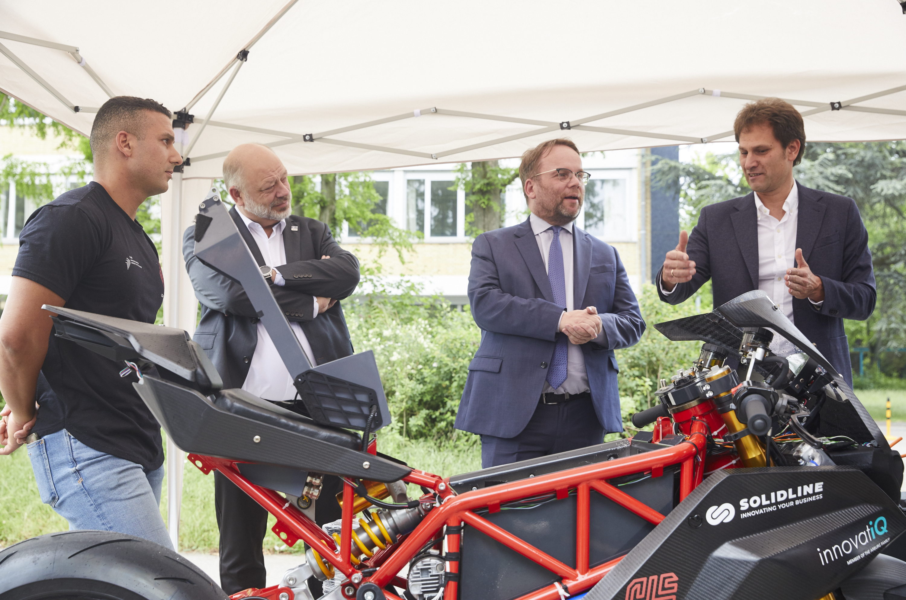 Studierende aus vier Fachbereichen der h_da entwickeln derzeit das Elektro-Sportmotorrad „Gauss II“. Das interdisziplinäre Team erprobt daran neueste Technologien in der Elektromobilität. Der Prototyp ihres E-Superbikes ist als Alleinstellungsmerkmal mit einem Wechselakku ausgestattet, was bei Rennen im Boxenstopp von Vorteil sein kann. Elektromobilitäts-Experte Prof. Dr. Jens Hoffmann vom Fachbereich Elektrotechnik und Informationstechnik und seine Studierenden demonstrierten das Motorrad bei einer Test-fahrt auf dem Campus und zeigten dem Minister, dass studentische Forschungsarbeit auch ein echter Blickfang sein kann.