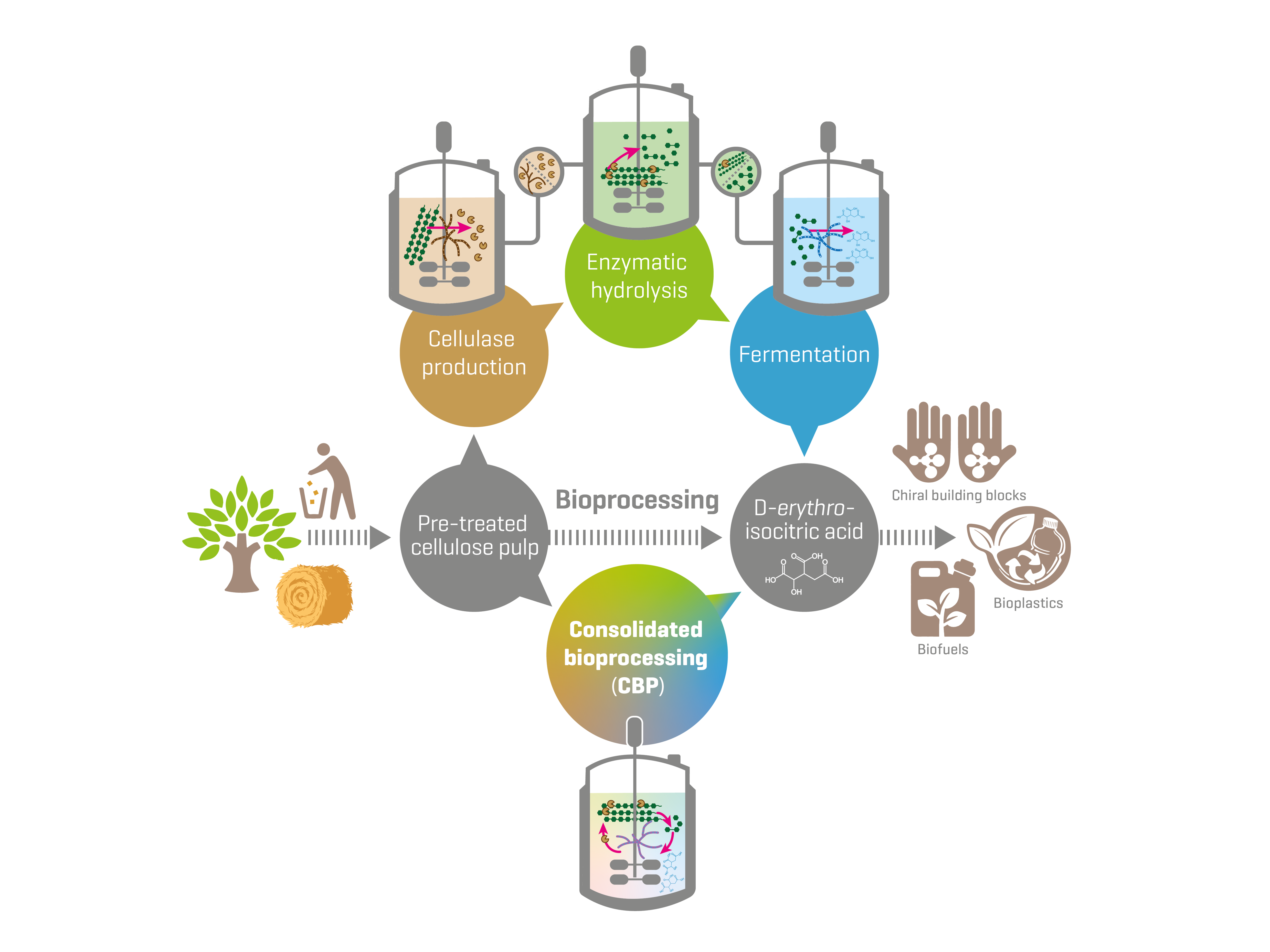 Ein vielversprechender Ansatz ist die so genannte konsolidierte Bioprozesstechnik (engl. consolidated bioprocessing [CBP]), bei der verschiedene Verfahrensschritte unter Verwendung geeigneter Mikroorganismen zu einem einzigen Prozess zusammengefasst werden. Star des neuen biotechnologischen Verfahrens ist der Schimmelpilz Talaromyces verruculosus.