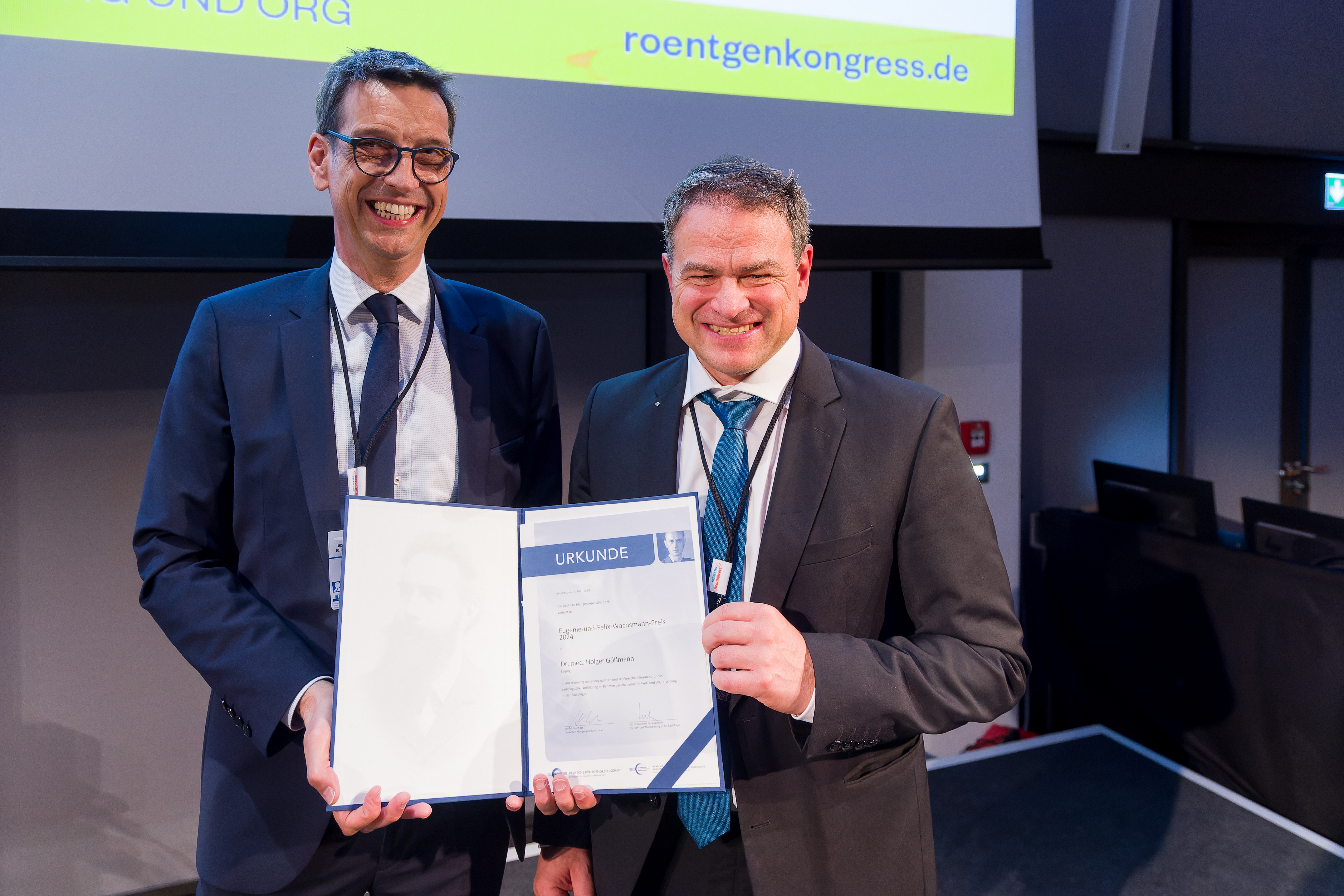 Der stellvertretende Direktor der Klinik und Poliklinik für Diagnostische und Interventionelle Radiologie am Universitätsklinikum Leipzig (UKL) Dr. Holger Gößmann ist mit dem Eugenie-und-Felix-Wachsmann-Preis ausgezeichnet worden. Damit ehrt die Deutsche Röntgengesellschaft (DRG) Menschen, die sich für das Akademie-Programm der Fachgesellschaft engagieren. Dr. Gößmann erhielt den Preis für seinen Einsatz in der Fort- und Weiterbildung von Ärzt:innen, Pflegekräften und Medizinischen Technolog:innen für Radiologie (MTR) – insbesondere im Bereich der Angiographie und der interventionellen Radiologie. Der Facharzt nahm den Preis jüngst beim Deutschen Röntgenkongresses in Wiesbaden entgegen.