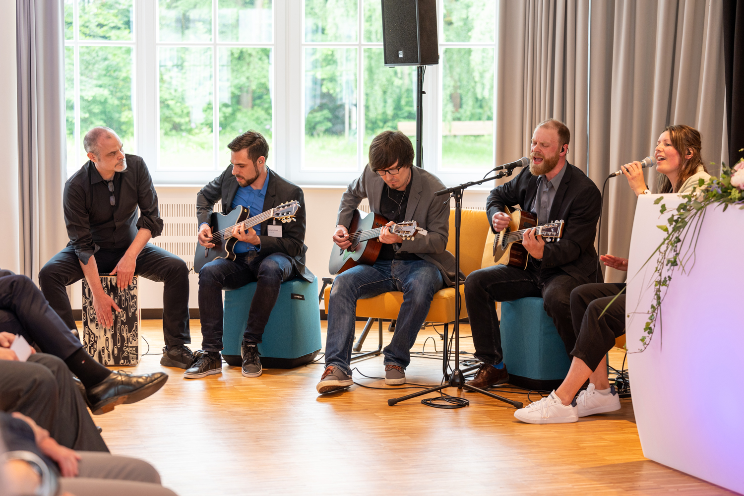 Musikalische Glückwünsche spielte die institutseigene Band »Foyer Tanzformation« zum Jubiläum. Die Band ist seit vielen Jahren fester Bestandteil des Instituts und alle Bandmitglieder sind Mitarbeitende des Instituts – und begeisterte Hobbymusikerinnen und -musiker.