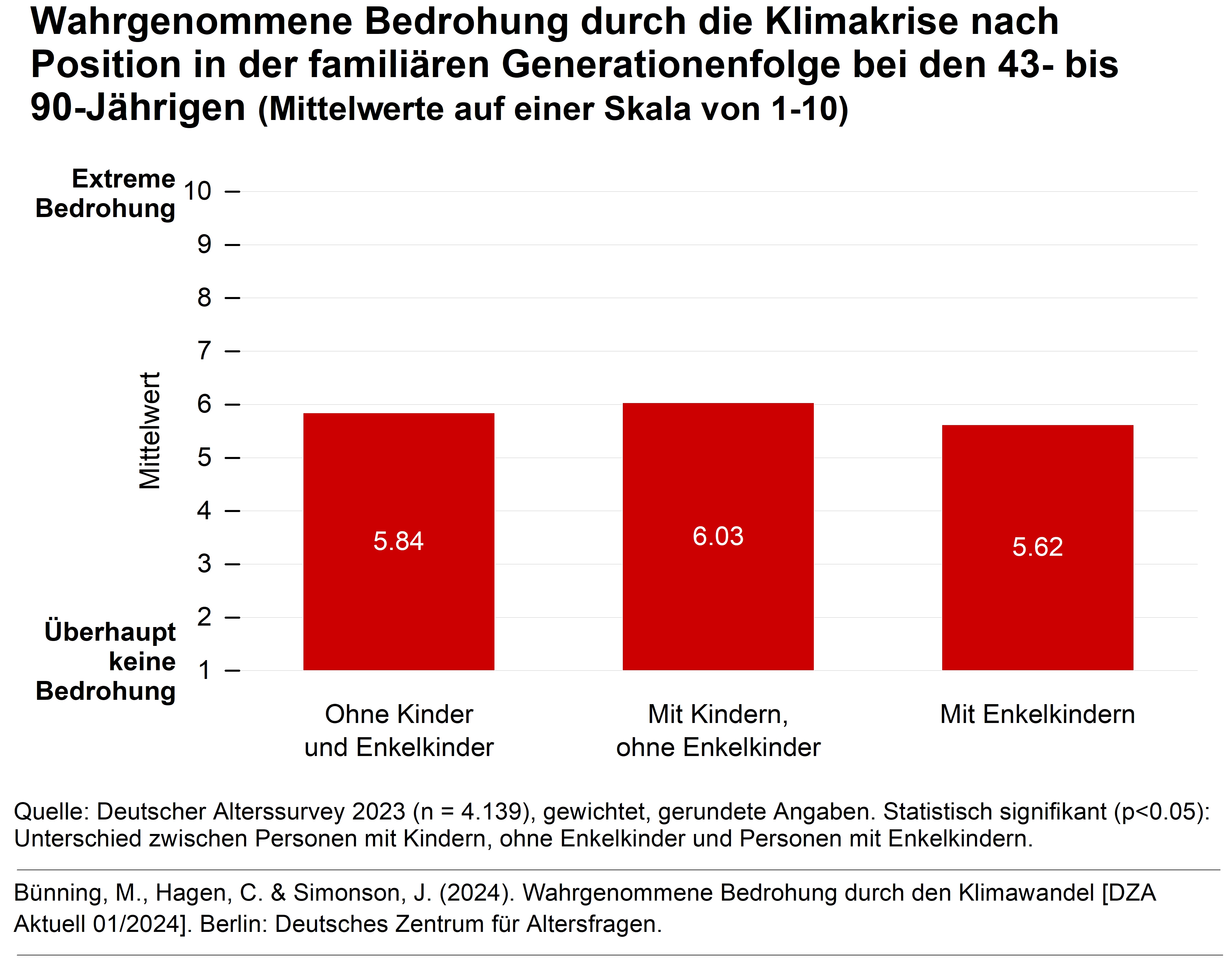 Bünning, M., Hagen, C. & Simonson, J. (2024). Wahrgenommene Bedrohung durch den Klimawandel in der zweiten Lebenshälfte [DZA Aktuell 01/2024]. Berlin: Deutsches Zentrum für Altersfragen. [DZA Aktuell 01/2024]. Berlin: Deutsches Zentrum für Altersfragen. Online: https://www.dza.de/fileadmin/dza/Dokumente/DZA_Aktuell/DZA-Aktuell_01_2024_Bedrohung_Klimawandel.pdf