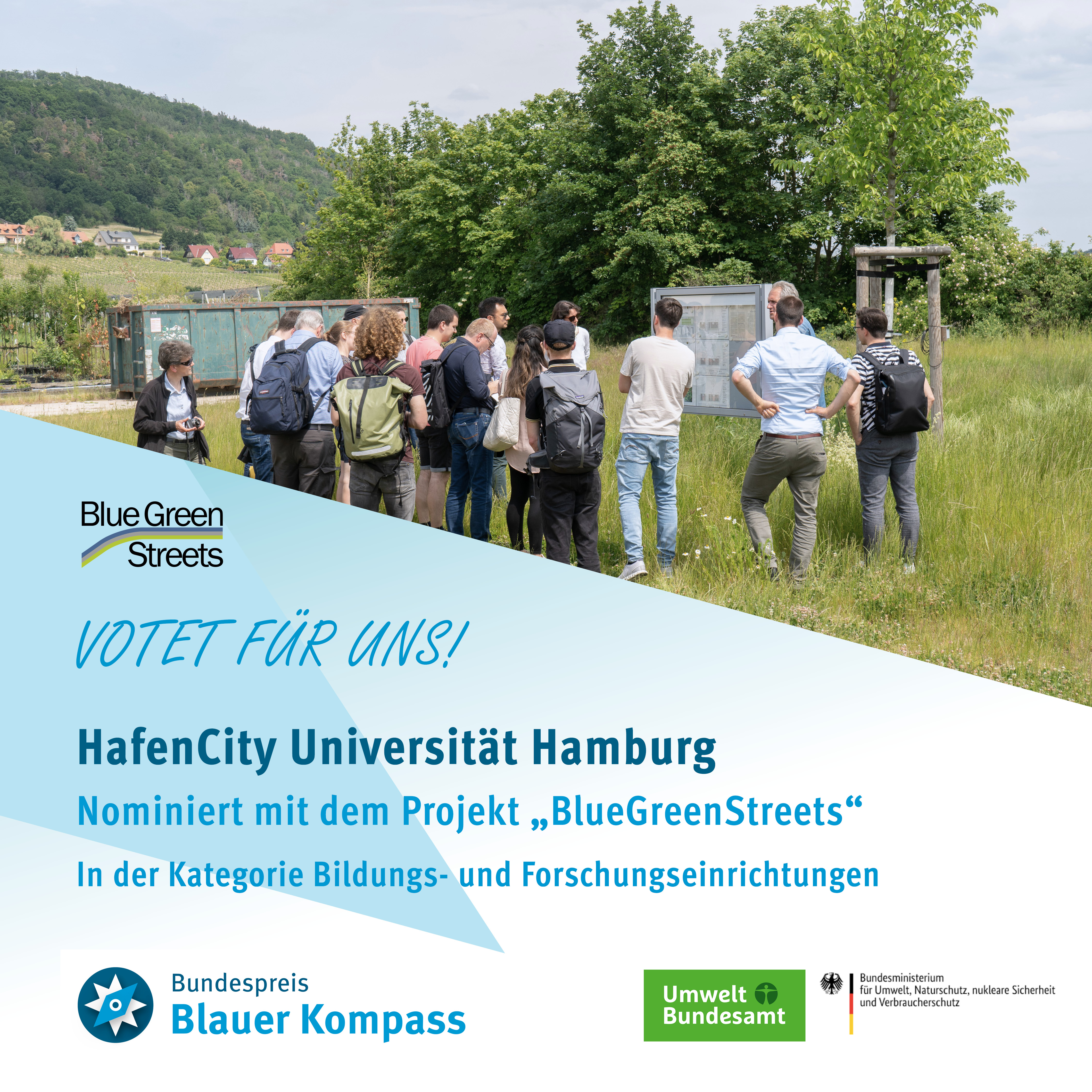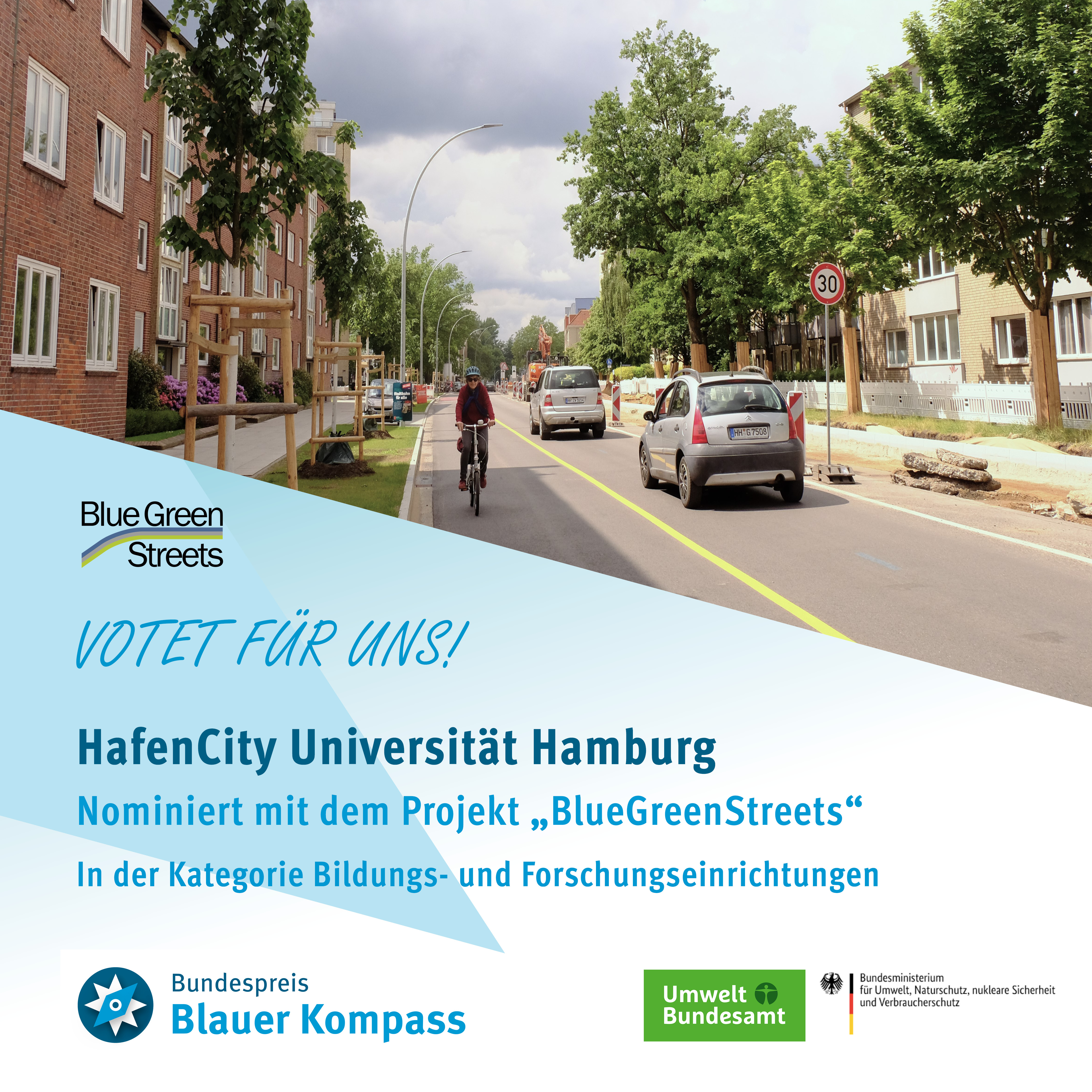 Das Projekt „BlueGreenStreets“ der HafenCity Universität Hamburg konkurriert ab sofort in der Kategorie "Forschungs- und Bildungseinrichtungen" um den Community-Preis beim Bundespreis „Blauer Kompass“ von Umweltbundesamt und Bundesumweltministerium.