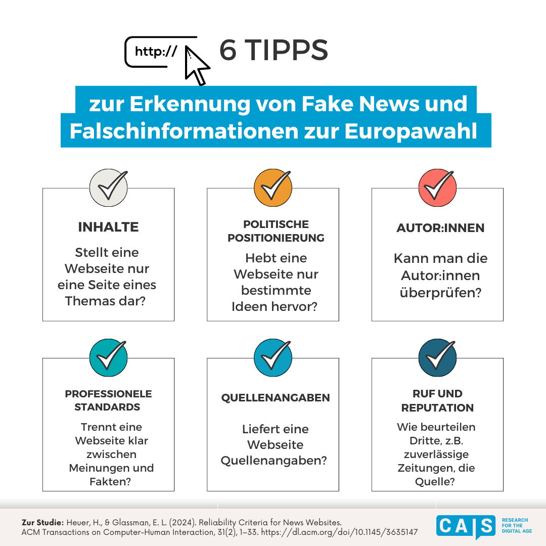In Zeiten, in denen Fake News Wahlen beeinflussen können, ist es entscheidend, dass Wähler:innen verlässliche Informationen von Falschinformationen unterscheiden können. Dies gilt besonders für die bevorstehende Europawahl. Eine informierte Wählerschaft ist entscheidend für die Stabilität der Demokratie. Vor diesem Hintergrund haben Prof. Dr. Hendrik Heuer vom Center for Advanced Internet Studies (CAIS) und Elena L. Glassman von der Harvard University untersucht, wie Bürger:innen die Glaubwürdigkeit von Nachrichtenwebseiten effektiv beurteilen können.