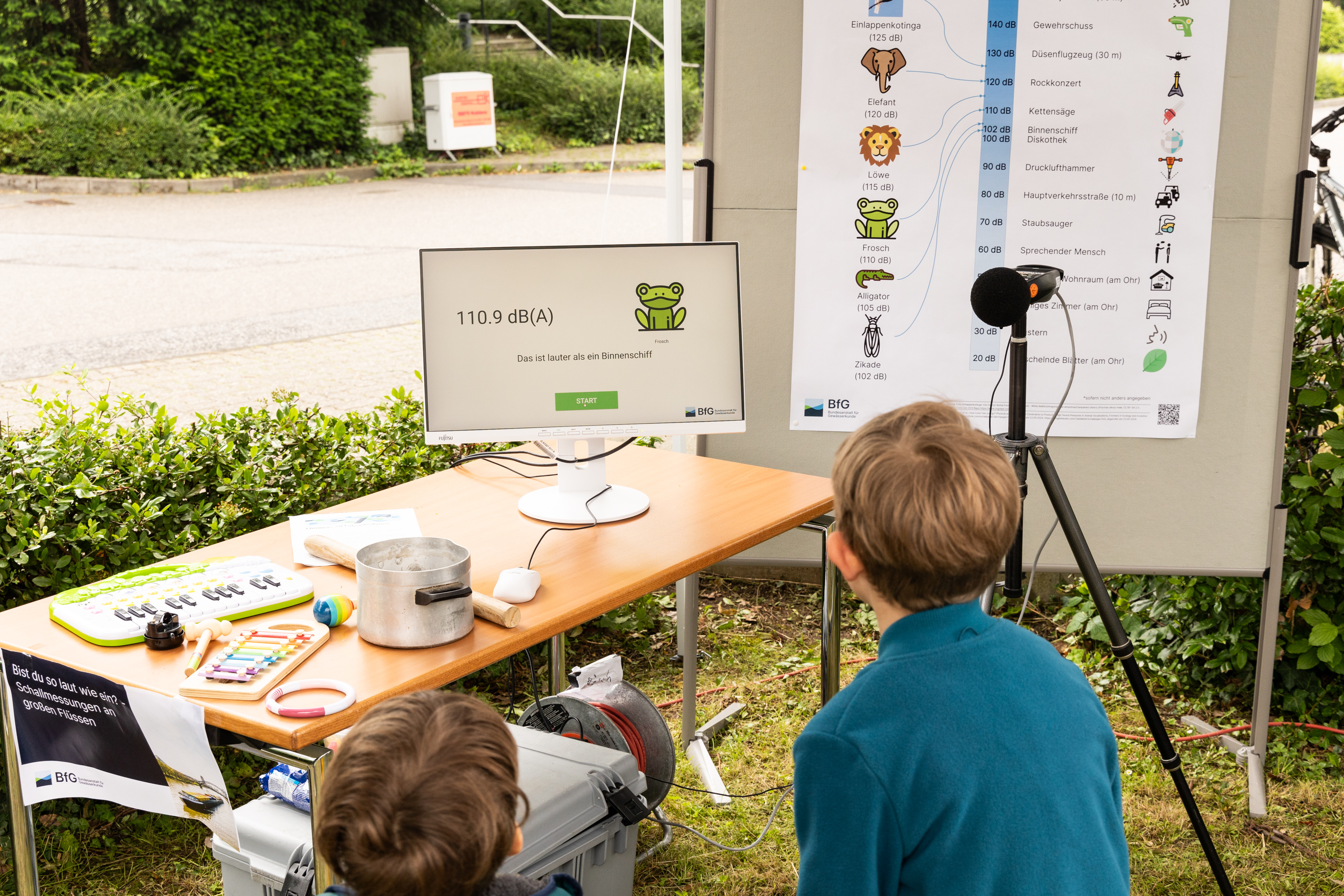 Gewässer eintauchen. An der Station „Schallmessung“ zum Beispiel staunten die Besucherinnen und Besucher nicht schlecht: Einzelne Kinder bewiesen, dass sie so laut wie ein Löwe brüllen können. An anderer Stelle versuchten Kinder, Steine zu verstecken. Da sie diese zuvor durch Berührung „zum Leuchten“ gebracht hatten, konnten die Steine mit Live-Temperaturmessungen entdeckt werden. Normalerweise unterwegs im Auftrag für die Bundeswasserstraßen, ergaben sich so ganz neue Einsatzgebiete für die BfG-Drohne, deren Wärme-Sensoren an diesem Tag einen neuen Einsatzzweck erhielten. Weiter ging es mit vielen Pflanzen zum Anfassen, Riechen, Meiden und Bestaunen an der Station „Botanischer Streichelzoo“. Durch die Vielfalt der Pflanzen verstanden die Besuchenden den Unterschied von heimischen und zugezogenen Pflanzen, sogenannten Neophyten, die bei der Unterhaltung und Pflege der Bundesstraßen wichtig sind.
