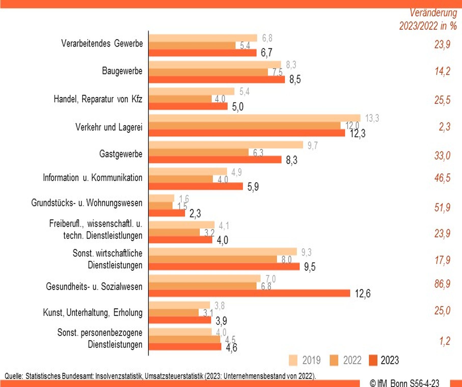 Das Gesundheits- und Sozialwesen – und darunter insbesondere Krankenhäuser und größere Pflegeeinrichtungen – sowie der Verkehrssektor waren in 2023 am häufigsten von Insolvenzen betroffen. Das zeigt der Anteil der insolventen Unternehmen am Unternehmensbestand. Dagegen traf die krisenhafte Entwicklung im Baubereich (noch) nicht die Masse der Bauunternehmen, sondern vorrangig Bauträger sowie Projekt- und Immobilienentwickler, die teils zum Bereich Grundstücks- und Wohnungswesen zählen. Daneben stieg die Insolvenzgefahr im Bereich Information und Kommunikation sowie im Gastgewerbe deutlich an.