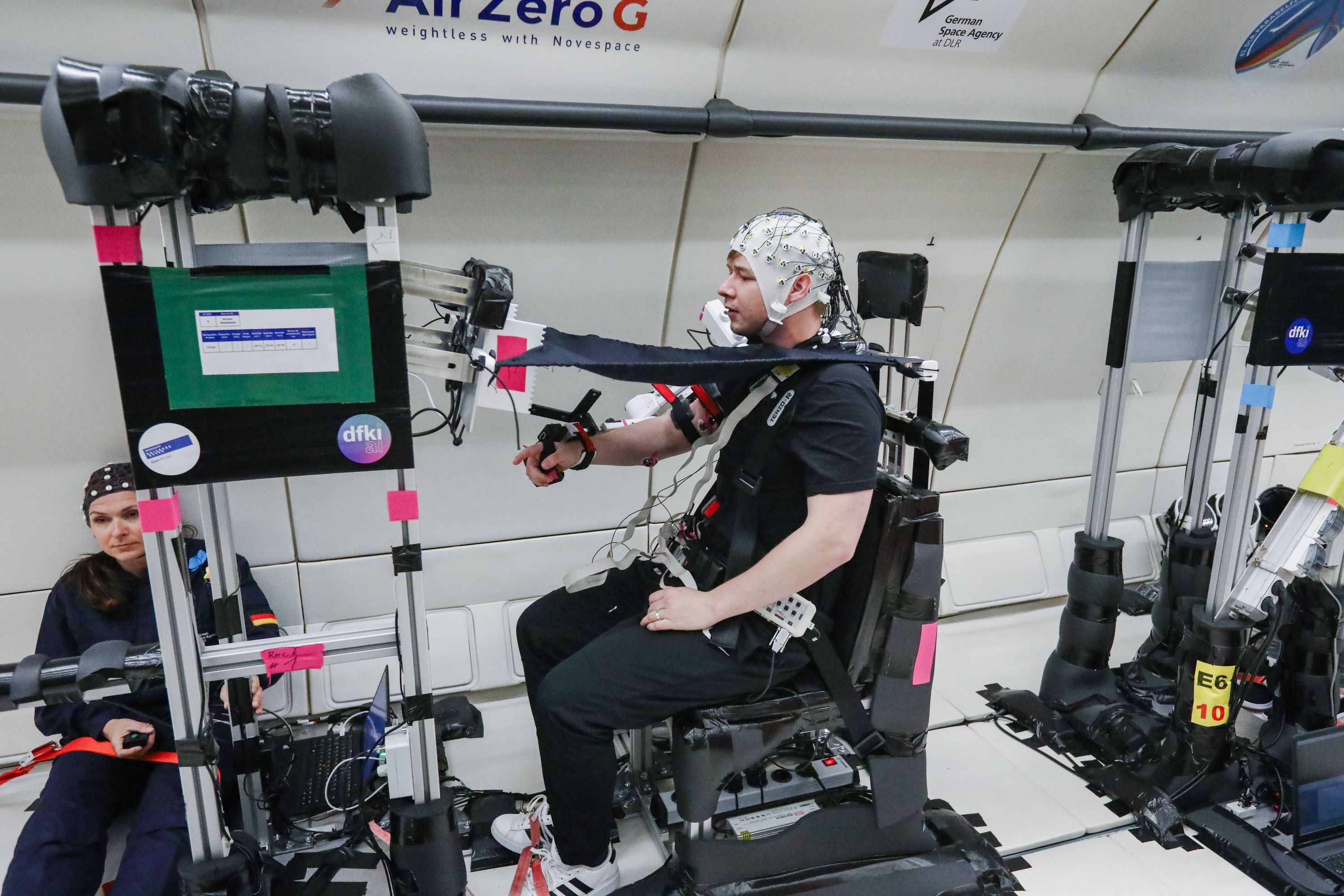 Parabelflug mit Exoskelett: DFKI und Uni Duisburg-Essen führen Versuche zur Feinmotorik in Schwerelosigkeit durc