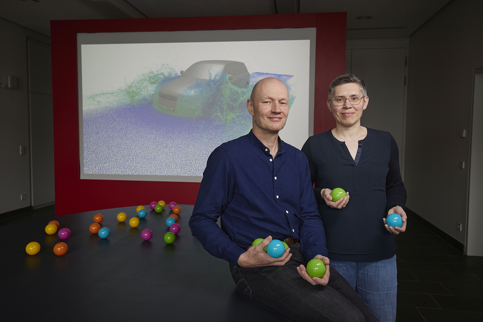 Klassischerweise kommt bei Simulationen die Finite-Elemente-Methode zum Einsatz: Ingenieurinnen und Ingenieure konstruieren dafür ein Gitternetz passend für die jeweilige Geometrie und berechnen darauf aufbauend die Veränderungen in jedem einzelnen Element. Bereits das Aufsetzen der Gitterstruktur ist sehr zeitaufwändig; auch während der Simulation muss sie immer wieder angepasst werden. Die Software MESHFREE kombiniert dagegen die Generalisierte Finite-Differenzen-Methode zur Lösung der Erhaltungsgleichungen für Masse, Impuls und Energie mit effizienten Algorithmen zur Lösung linearer Gleichungssysteme, die vom Fraunhofer-Institut für Algorithmen und Wissenschaftliches Rechnen SCAI mitentwickelt wurden – ein gewaltiger Vorteil, denn die verwendete numerische Punktewolke ist dazu in der Lage, sich flexibel an bewegliche Geometrien anzupassen. Aufwändige Nachkorrekturen im Rechengitter entfallen. Für ihre Entwicklung, die reale Versuche ersetzen kann, erhielten Dr. Jörg Kuhnert und Dr. Isabel Michel den Joseph-von-Fraunhofer-Preis 2024.