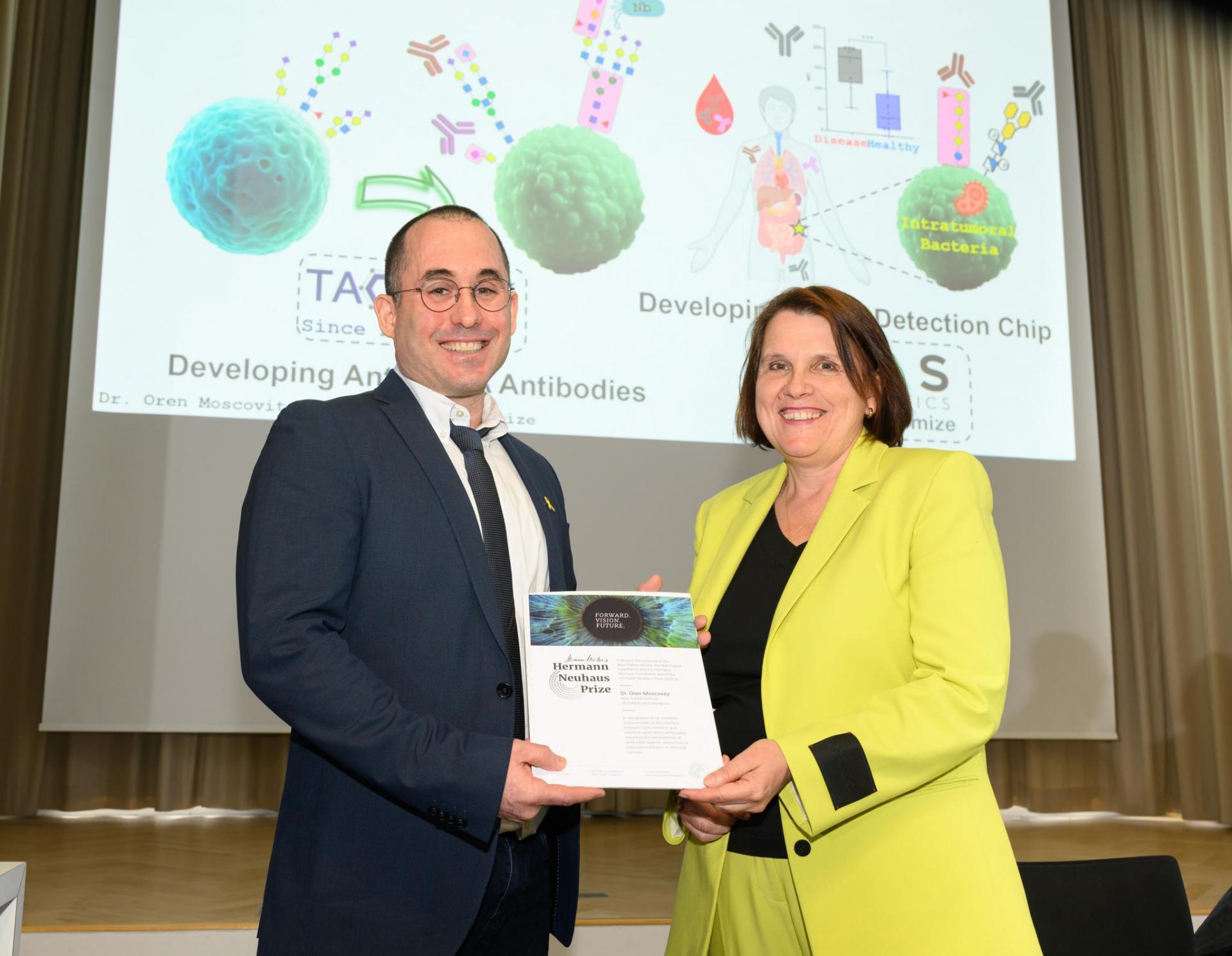 Dr. Oren Moscovitz wurde von der Max-Planck-Gesellschaft mit 25.000 Euro für seine vielversprechenden Forschungsergebnisse zur Behandlung und nicht-invasiven Diagnostik von Krebs ausgezeichnet, die künftig die Zahl der krebsbedingten Todesfälle senken könnten. Moscovitz und sein Team nutzen einzigartige Zuckermuster auf Krebszellen und entwickeln ultrakleine Antikörper (sogenannte Nanokörper) aus Alpakas, die spezifisch an diese Zucker binden. Zwei Start-ups arbeiten bereits daran, diese Erkenntnisse in die Praxis umzusetzen.