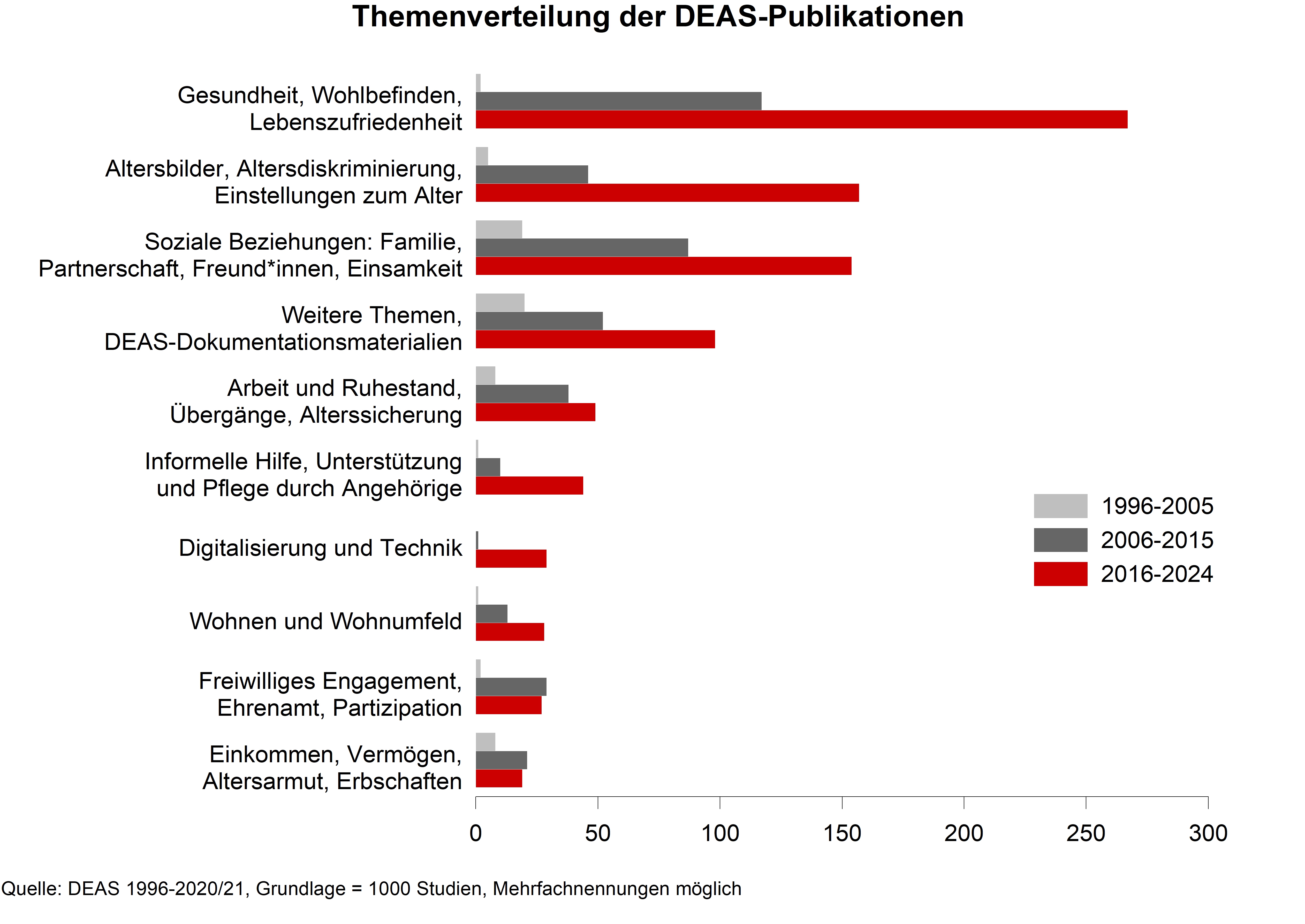 Es zeigt sich über die Zeit hinweg ein deutlich gestiegenes Interesse an Gesundheitshemen und in der wachsenden Anzahl von Publikationen zu Altersbildern, Altersdiskriminierung und Einstellungen dürfte sich ein sich veränderndes Bewusstsein widerspiegeln. Zudem werden Aspekte sozialer Beziehungen immer häufiger auf Grundlage der DEAS-Daten analysiert.