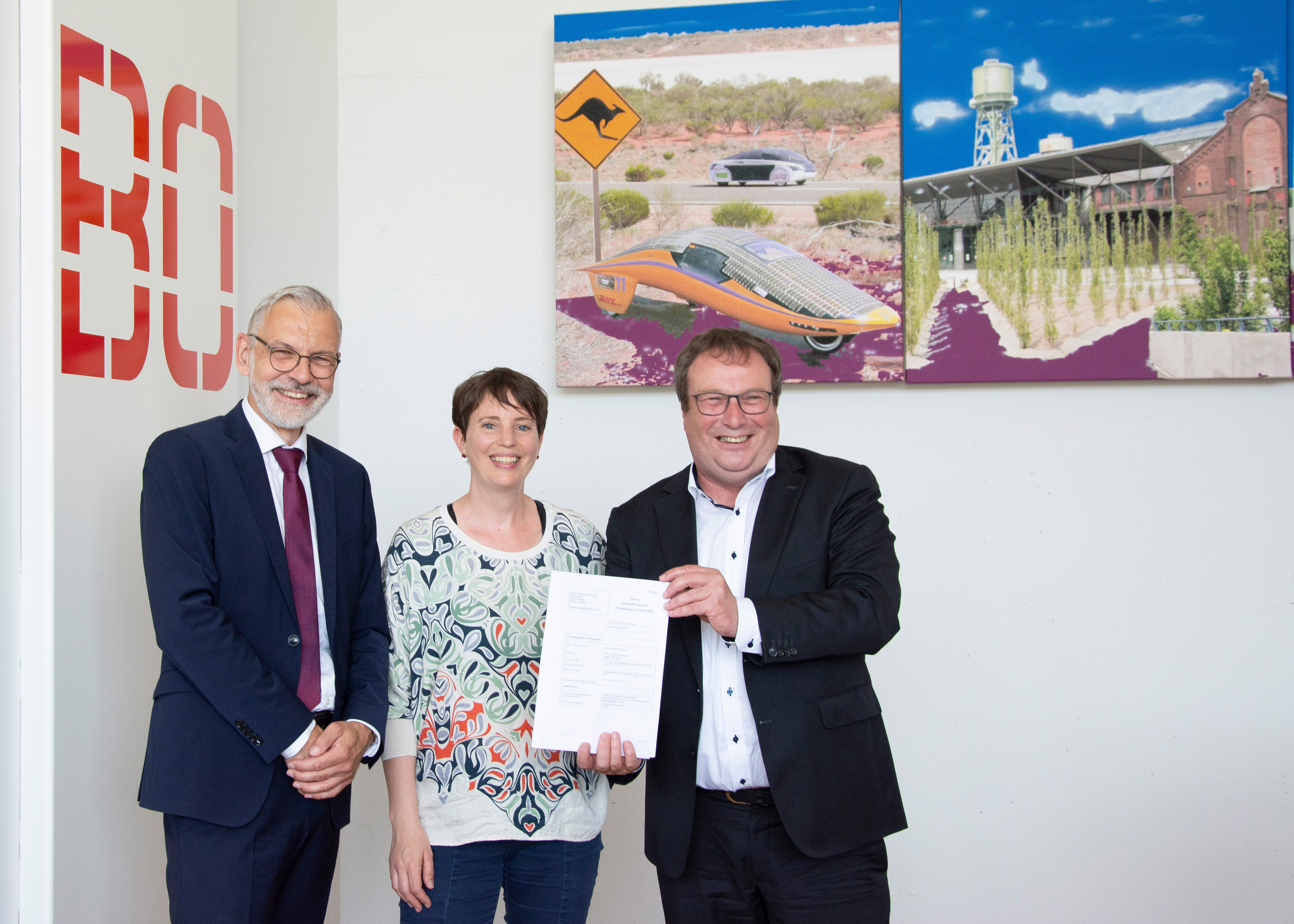 Die Fahrradprofessur NRW wird tatsächlich an der Hochschule Bochum angesiedelt. Am 25. Juni überreichte Landesverkehrsminister Oliver Krischer im Beisein von Bochums Oberbürgermeister Thomas Eiskirch den entsprechenden Zuwendungsbescheid persönlich vor Ort an Hochschulpräsident Prof. Dr. Wytzisk-Arens. Der Minister besuchte an diesem Tag auch den Mobilitätstag der Hochschule, der zugleich Leistungsschau aus Forschung und Lehre wie auch Orientierungsangebot in Sachen Mobilität für alle Hochschulangehörigen war.