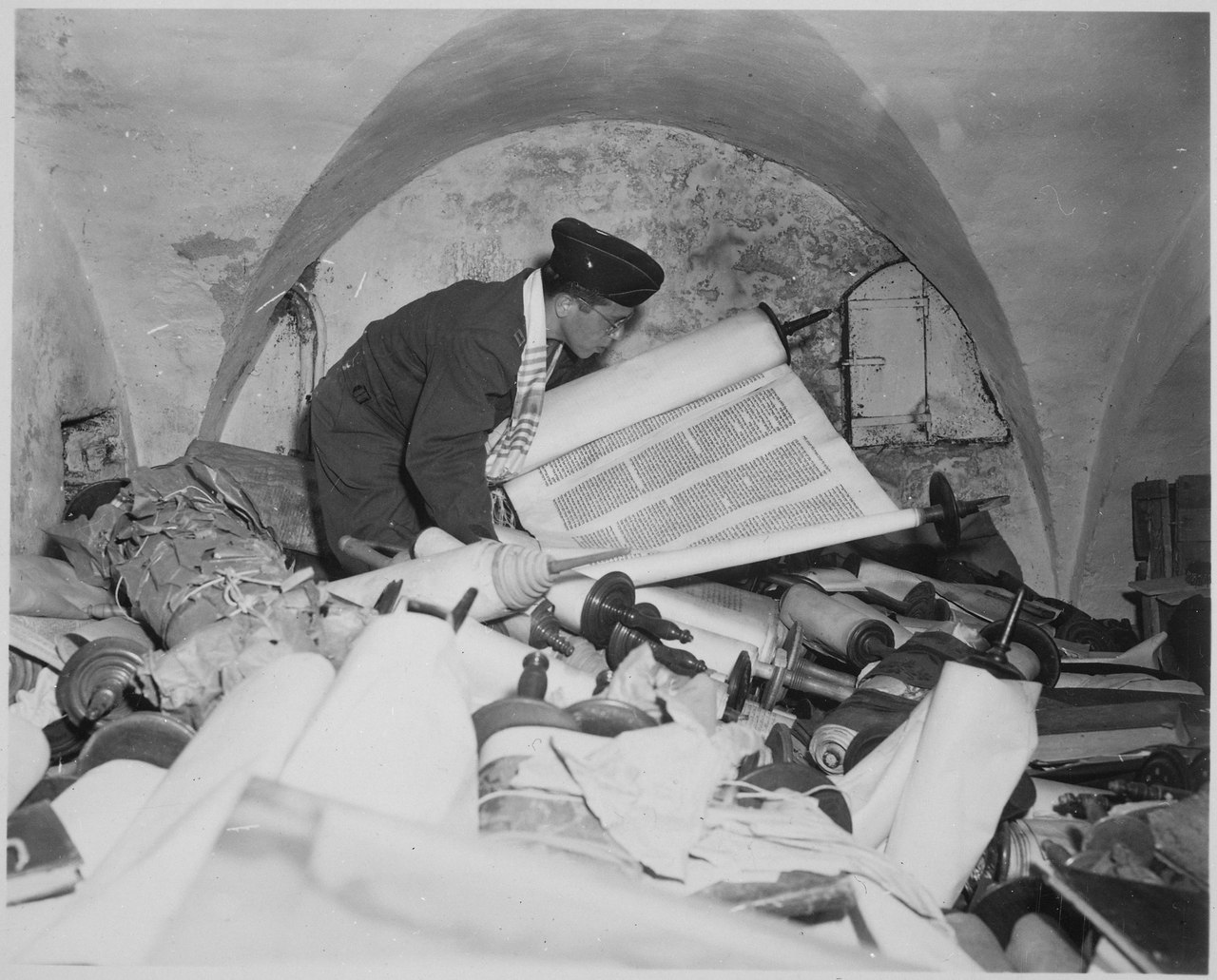 Photo 1: In the cellar of the Institute for the Study of the Jewish Question: Chaplain Samuel Blinder sifts through Torah scrolls looted by the Einsatzstab Reichsleiter Rosenberg, July 6, 1945 (Copyright: United States Holocaust Memorial Museum, Washington, D.C., photo number: 82978, photographer: Irving Katz, Courtesy)
