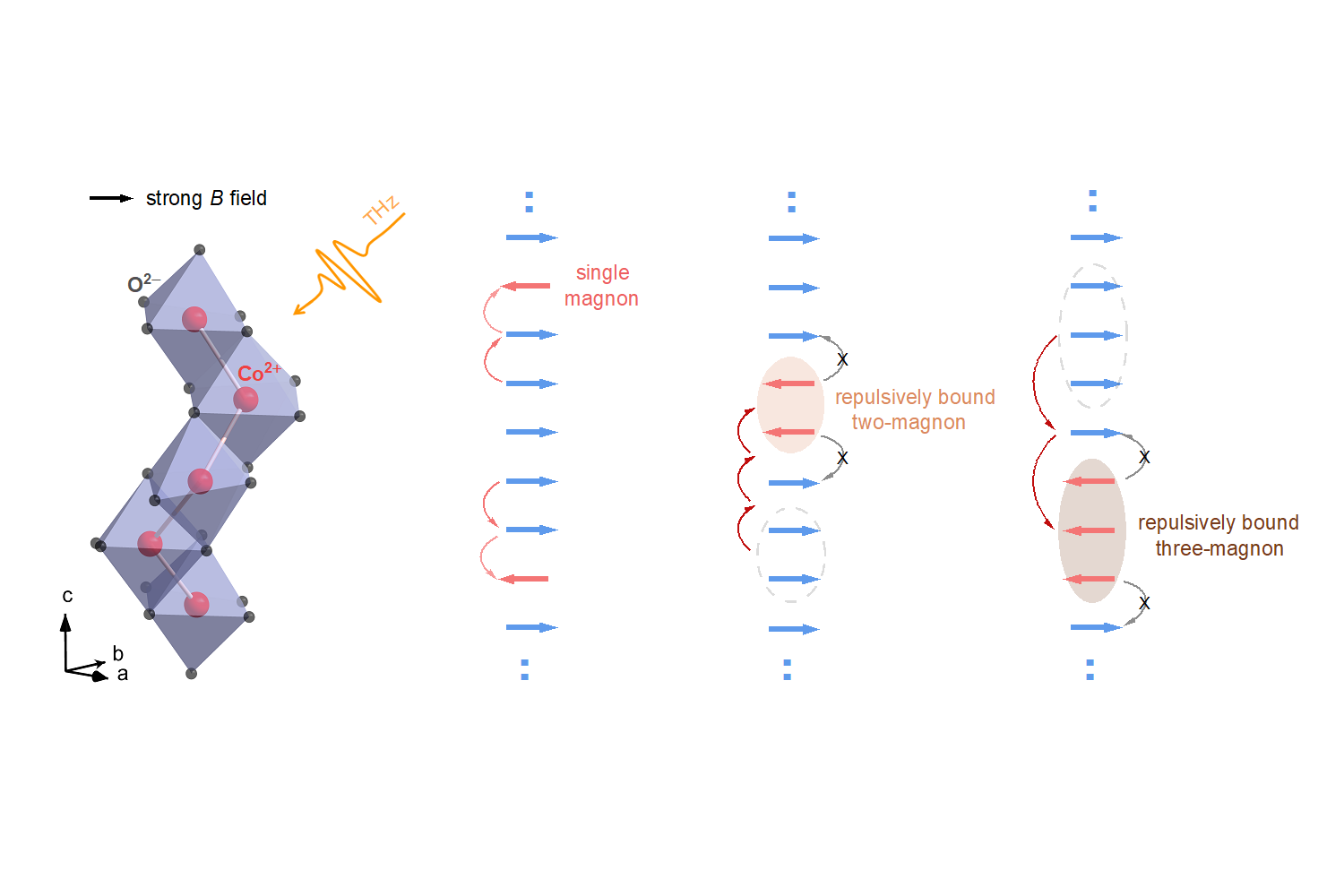 They observed this state in BaCo2V2O8, a special spin chain compound. A spin is the intrinsic magnetic degree of freedom of electrons in an atom. The team used terahertz light sources to excite the spins in BaCo2V2O8 and study their dynamics in strong external magnetic fields of up to 60 tesla. On the one hand, the researchers detected the magnons already known, i.e. low-energy elementary magnetic quasiparticle excitations. On the other hand, however, they also discovered the special repulsively bound two-magnon and three-magnon states as high-energy composite excitations. The compound BaCo2V2O8 is a solid-state realization of the Heisenberg-Ising model, which for over a hundred years has played an important role in understanding many physical phenomena. The model has already influenced various branches of physics – from condensed matter to cold atoms and quantum information.