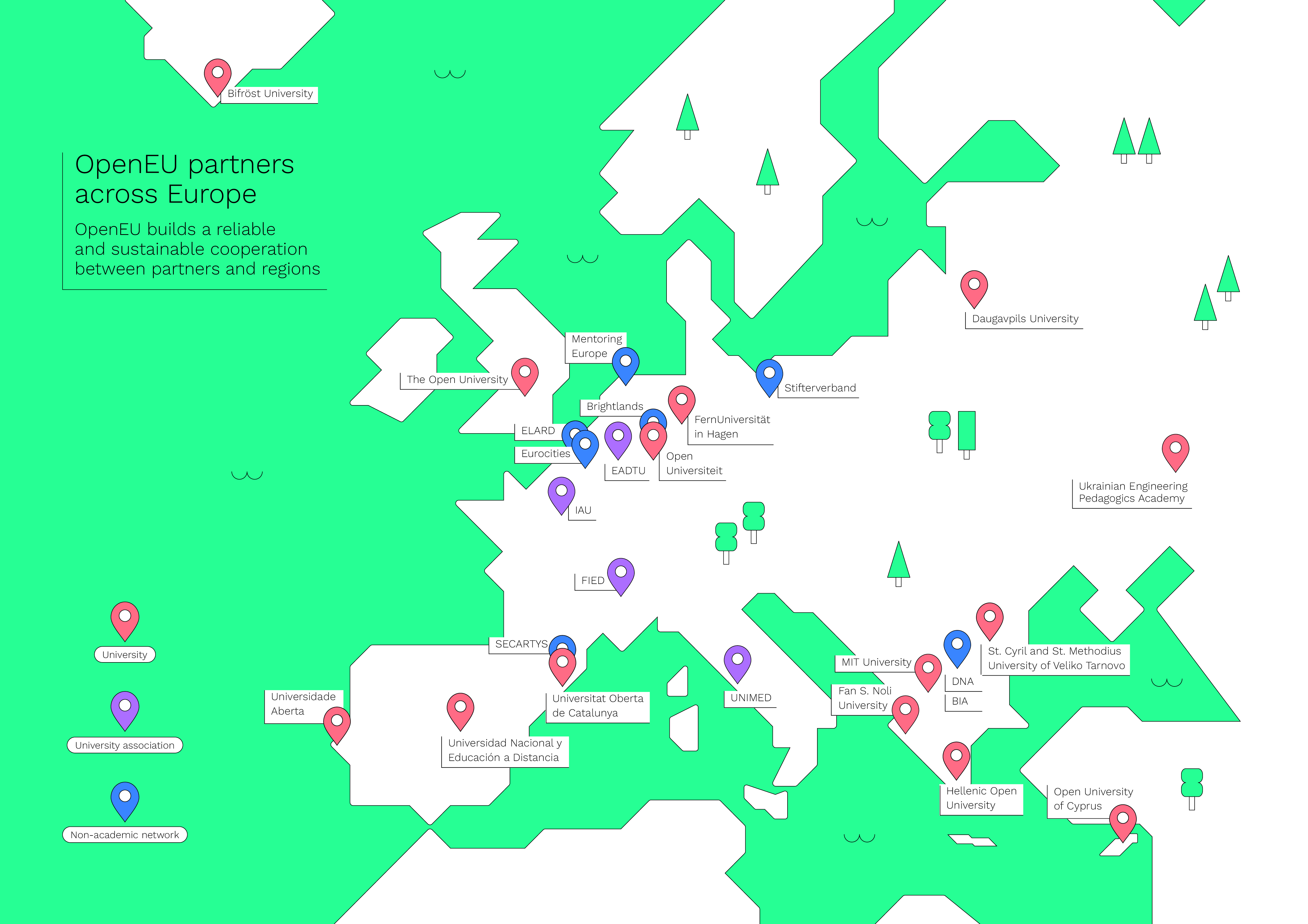 Die Europäische Kommission hat beschlossen, das Projekt OpenEU im Rahmen ihrer Initiative Europäische Hochschulen zu unterstützen. Sie wählte es aus 56 Vorschlägen aus, die von europäischen Allianzen eingereicht wurden. OpenEU kann nun dank der 14,4 Millionen Euro, die es erhalten hat, weiter voranschreiten. Die Allianz bringt Europas führende offenen und Fernuniversitäten sowie fünf Präsenzuniversitäten zusammen, die sich verpflichtet haben, ihre digitale Transformation voranzutreiben. Gemeinsam setzen sie sich für eine studierendenzentrierte, inklusive, digitale und nachhaltige Bildung ein, die den Europäischen Hochschulraum stärkt und dafür sorgt, dass niemand zurückgelassen wird.