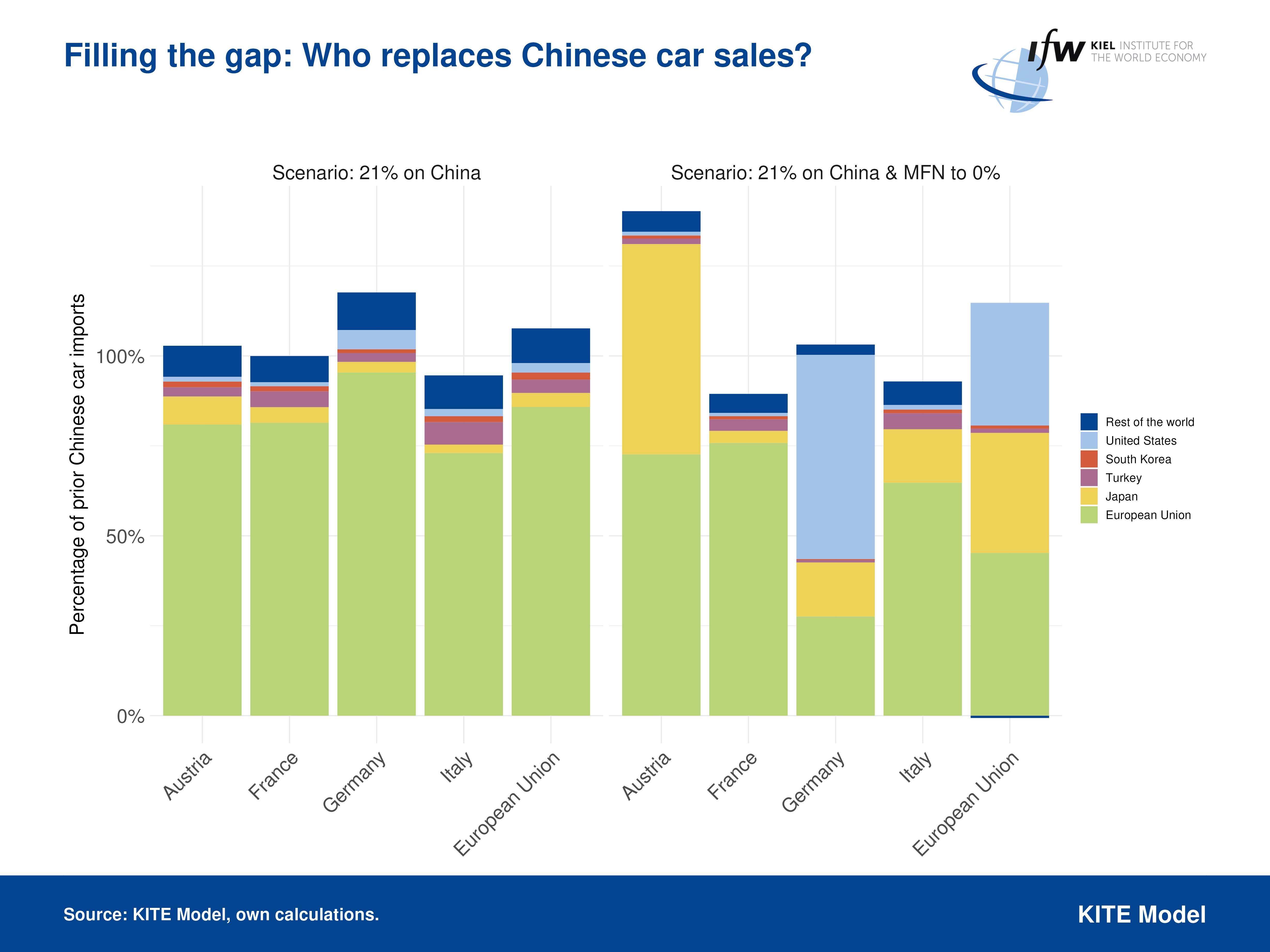 Das Kiel Institut für Weltwirtschaft (IfW Kiel), das Österreichische Institut für Wirtschaftsforschung (WIFO) und das Supply Chain Intelligence Institute Austria (ASCII) zeigen anhand von Simulationen eines Handelsmodells (des KITE-Modells) mit vielen Ländern und Sektoren, dass durch die ab dem 4. Juli 2024 geltenden vorläufigen Ausgleichzölle, die Einfuhren von Kraftfahrzeugen aus China um 42 Prozent zurückgehen werden. Dieser Rückgang wird größtenteils durch höhere Verkäufe europäischer Produzenten in der EU und teilweise durch höhere Einfuhren aus Drittländern ausgeglichen. Die Autopreise werden durch die Ausgleichszölle langfristig aber nur geringfügig beeinflusst. So könnten in der EU die Preise für Elektroautos um durchschnittlich 0,3 bis 0,9 Prozent steigen und in China sinken. Kurzfristig könnten diese Effekte größer sein.