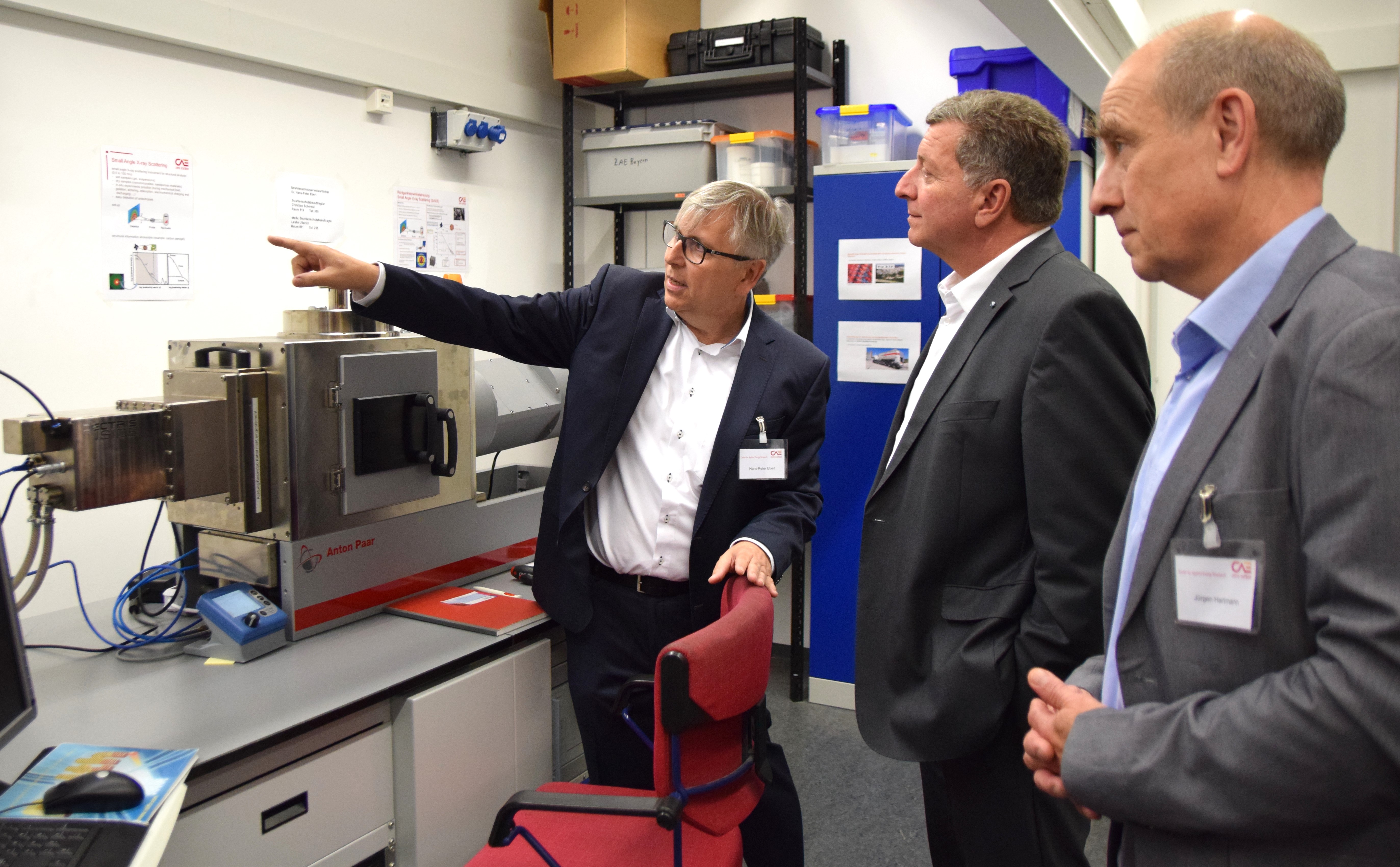 Gleich zu Anfang seines Besuches hatte Staatsminister Bernreiter die Gelegenheit sich bei einem Rundgang durch das CAE-Forschungs- und Demonstrationsgebäude einen ersten Eindruck von den laufenden Forschungsaktivitäten des CAE zu gewinnen. Schon während des Rundgangs mit CAE-Vorständen, Dr. Hans-Peter Ebert und Prof. Jürgen Hartmann sowie Arbeitsgruppenleitenden entwickelte sich eine fruchtbare Diskussion zu den drängenden Themen der Bauwirtschaft.