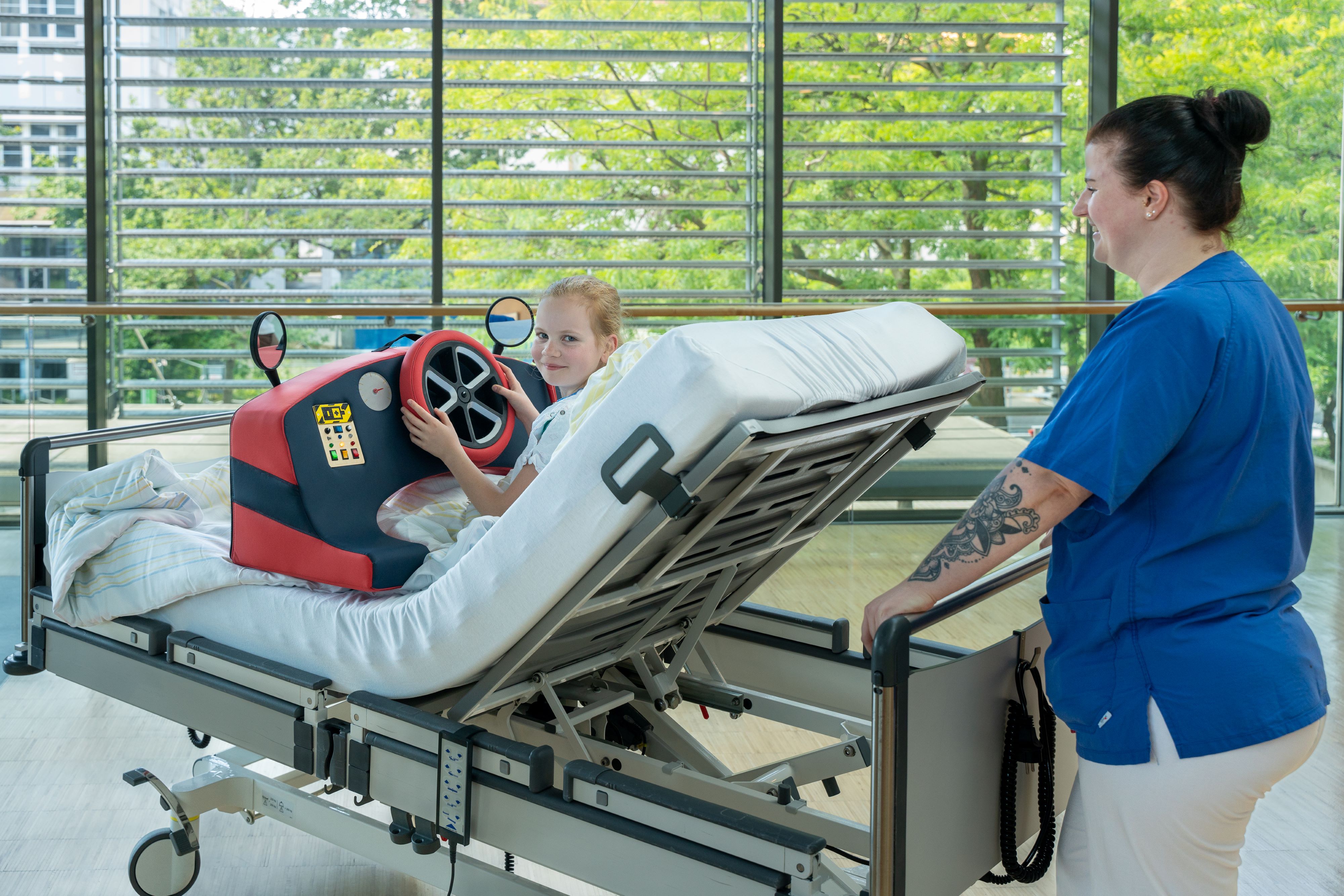 Um den kleinen Patientinnen und Patienten die Angst zu nehmen, kommt jetzt ein Bettaufsatz zum Einsatz. | Ausgestattet mit Hupe, Spiegeln und blinkenden Anzeigen lenkt das mobile Cockpit von der OP ab. | In der Kinderklinik gibt es viele Angebote, um Kinder und Jugendliche den Alltag angenehmer zu gestalten.