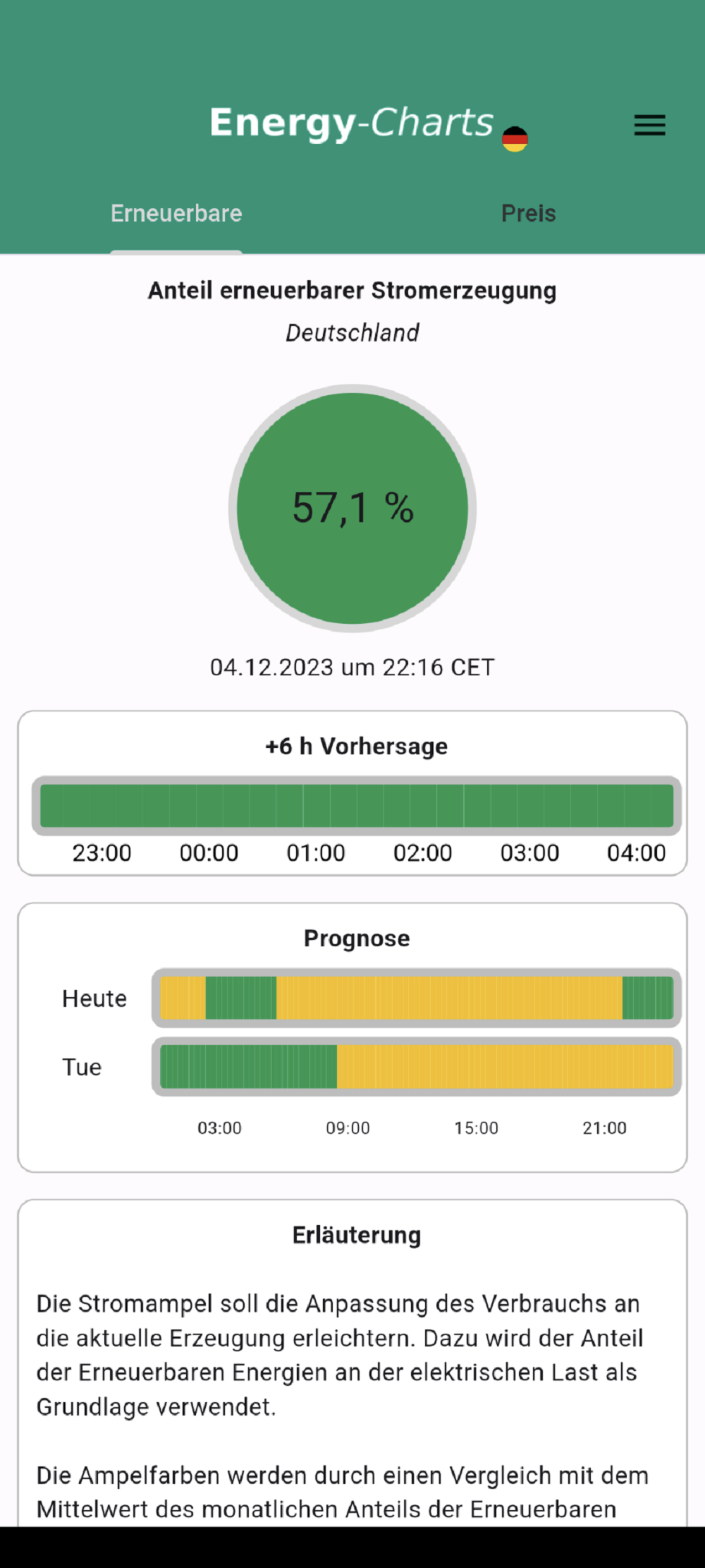 Seit Dezember 2023 wird die Webseite durch die »Stromampel-App« ergänzt, die für zwölf europäische Länder den aktuellen Anteil Erneuerbarer Energien an der Stromerzeugung sowie den für 34 Länder den Day-Ahead-Börsenstrompreis anzeigt. Besitze-rinnen und Besitzer von Elektroautos, Wärmepumpen oder Smart Homes können damit ihren Stromverbrauch so steuern, dass er einen möglichst grünen Strommix nutzt. Der führende europäische Hausgerätehersteller BSH Hausgeräte GmbH, zu der Marken wie Bosch, Siemens, Gaggenau und Neff gehören, setzt die Daten der Stromampel bereits ein. Die Daten stellt das Fraunhofer-Team auch auf der Webseite sowie über eine offene Schnittstelle (API) für alle Interessenten zur Verfügung.