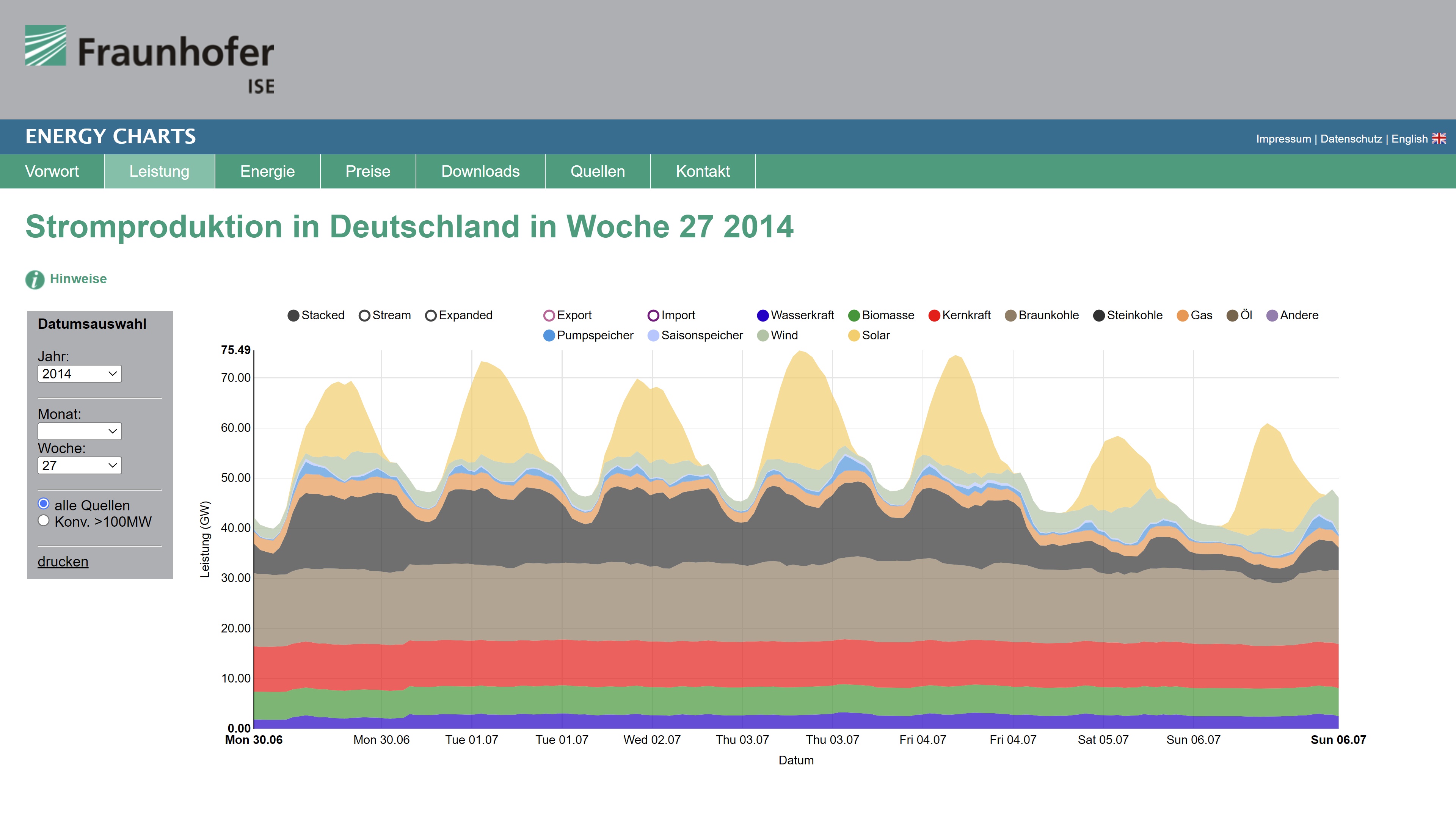 Kann Deutschland seinen Strombedarf aus erneuerbaren Energien decken? Wie viel Atom- und Kohlestrom wird importiert? Führt eine Sonnenfinsternis zu einem Blackout? Um die Diskussion zur Energiewende zu versachlichen, stellte das Fraunhofer-Institut für Solare Energiesysteme ISE vor zehn Jahren die Datenplattform »Energy-Charts« online. Die Webseite bietet heute ausführliche interaktive Daten rund um die deutsche Stromerzeugung, Klimadaten, Emissionen und Preise sowie Stromerzeugungs- und Börsendaten für 42 europäische Länder. Sie ist damit eine der umfangreichsten Datenplattformen zum Energiemarkt in Europa.