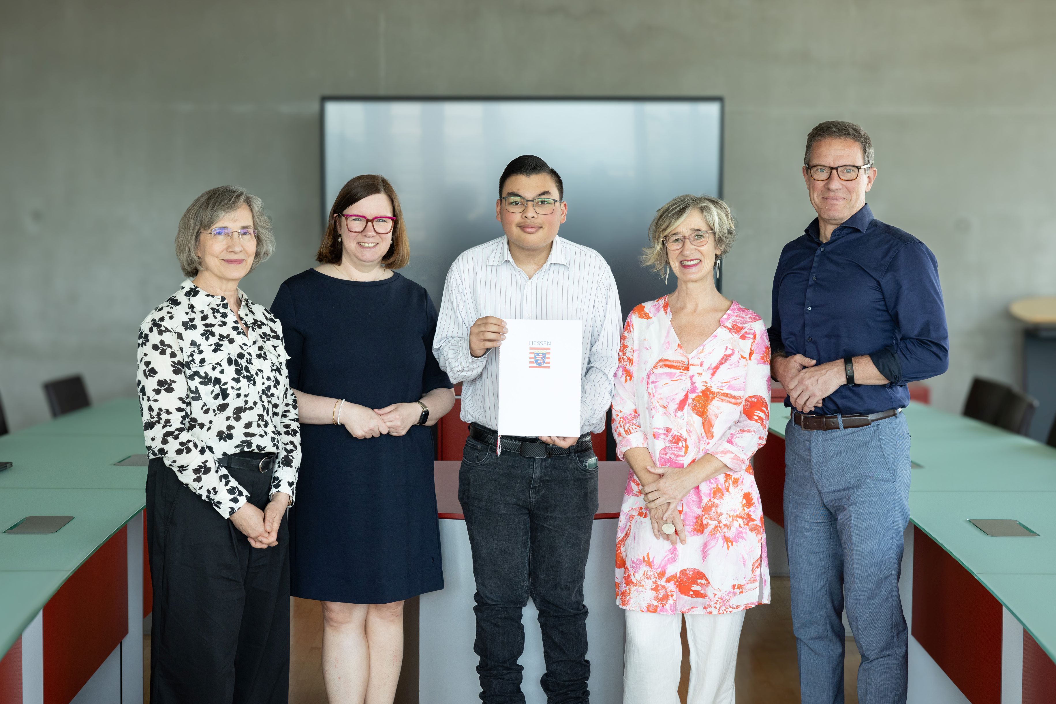 Projektleiterin Prof. Dr. Bettina Bretländer (2.v.r.), Prof. Dr. Barbara Klein (l.), Dekanin des Fachbereichs Soziale Arbeit und Gesundheit, Hochschulpräsident Prof. Dr. Kai-Oliver Schocke (r.) sowie Lovis Kosel, Mitglied im Projektbeirat und Experte in eigener Sache, freuen sich über den Förderbescheid, den Staatssekretärin Manuela Strube (2.v.l.) überreichte.