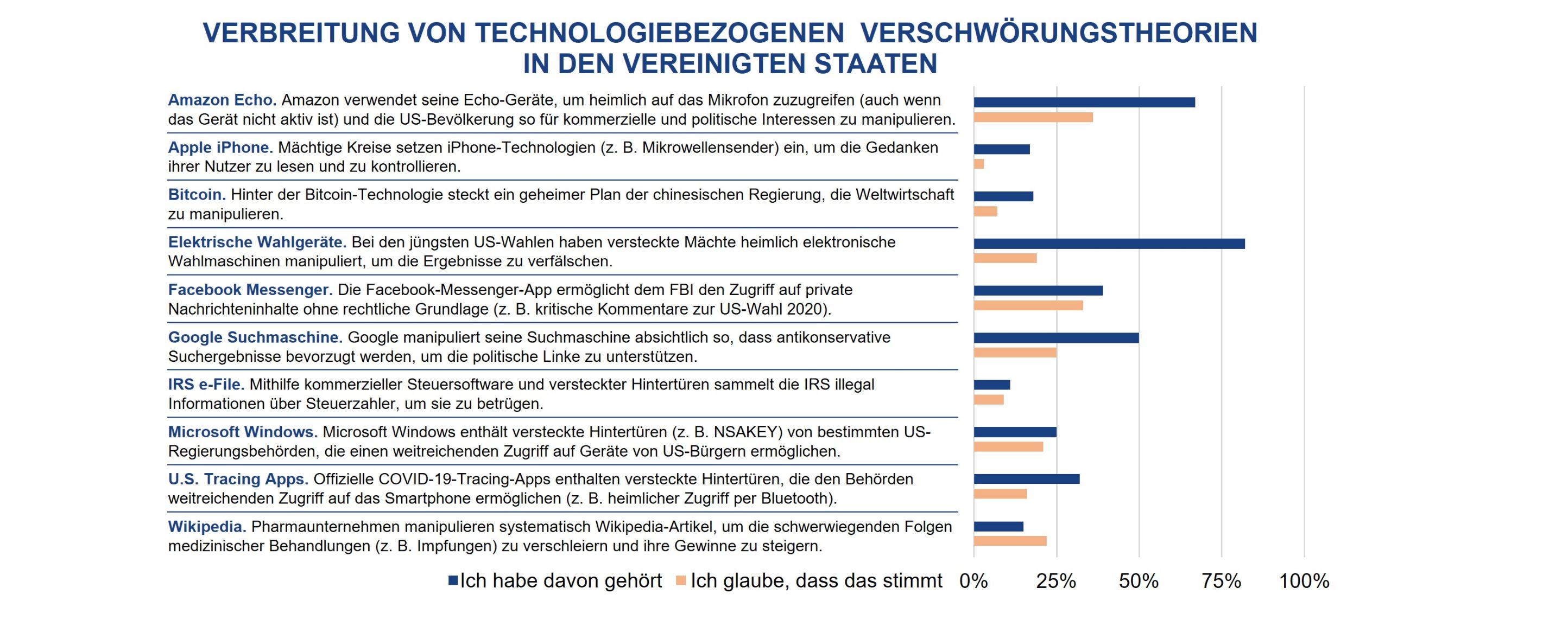 In einer Ausgangsbefragung von mehr als 1.000 Personen in den USA stellten die Autoren fest, dass der Glaube an technologiebezogene Verschwörungstheorien überraschend weit verbreitet ist. Aus den Daten geht hervor, dass bei sechs von zehn verschiedenen technologiebezogenen Verschwörungstheorien mindestens 20 Prozent der Teilnehmerinnen und Teilnehmer die Theorie kannten; bei fünf von zehn dieser Theorien glaubten mindestens 20 Prozent an sie. So haben beispielsweise 67 Prozent der Befragten von der Theorie gehört, dass die smarten Amazon Echo Lautsprecher die Nutzerinnen und Nutzer abhören, auch wenn das Gerät ausgeschaltet ist, um die Bevölkerung zu manipulieren. 36 Prozent der Befragten stimmten dieser Theorie zu.