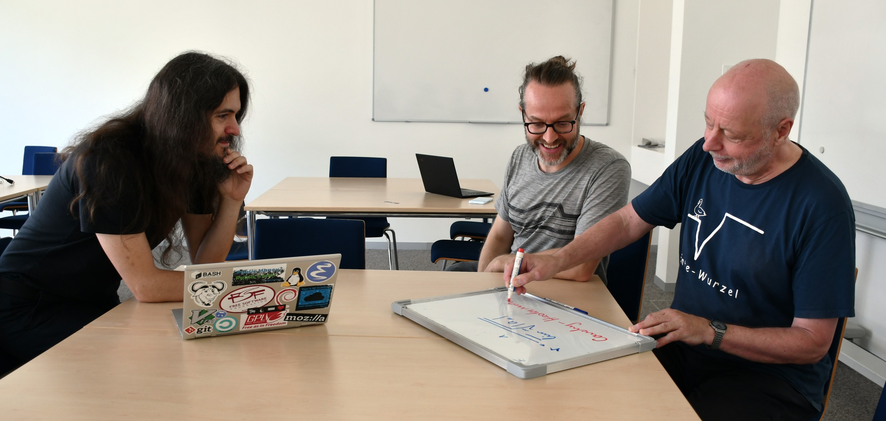 Mit seiner Idee rannte Prof. Dr. Martin Pohl nicht nur bei der Hochschulleitung offene Türen ein, auch in seiner eigenen Fakultät Informatik und Mathematik formte sich bereits bei den Kollegen Prof. Dr. Timo Baumann und Prof. Dr. Kai Selgrad die Vision einer Code Clinic. Jeder, der sich mit Programmieren beschäftigt, kann bei einer Code Clinic vorbeikommen und gemeinsam mit Tutoren Probleme besprechen.