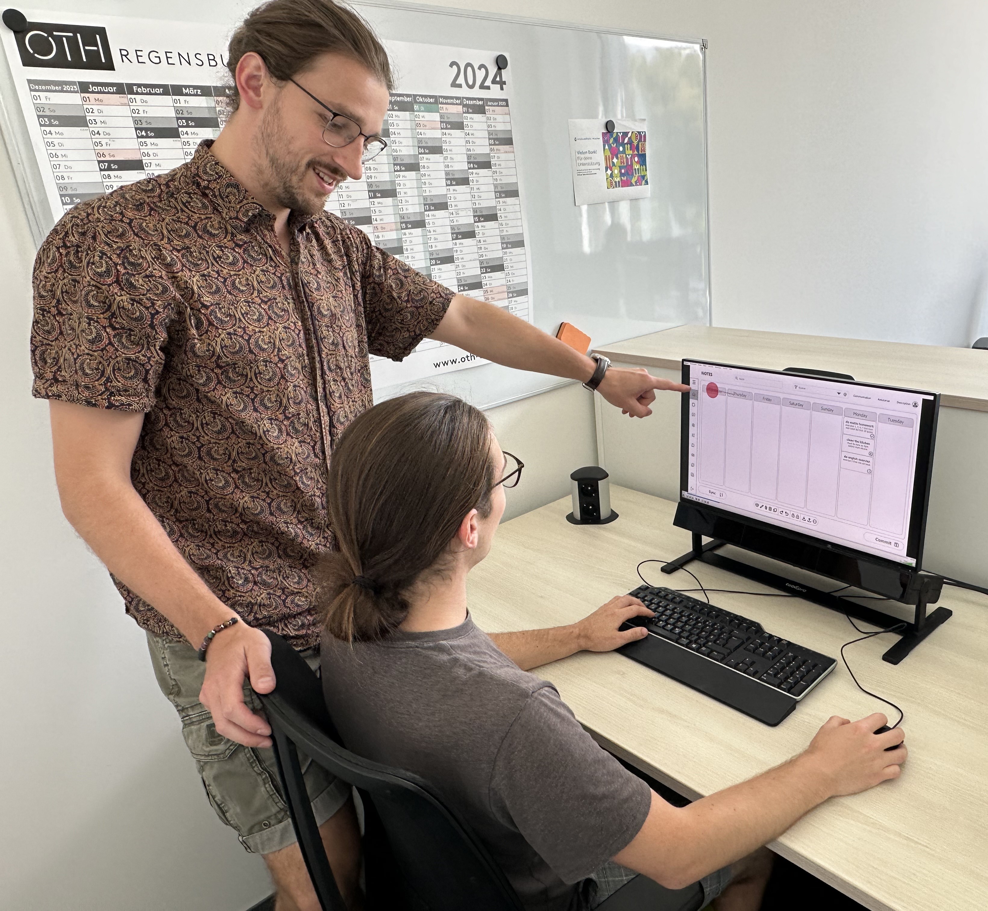 Und noch ein weiteres Projekt der OTH Regensburg wird über das „BayernMINT“-Förderprogramm unterstützt. Einen durch und durch technischen Ansatz für mehr Lernerfolg hat das Team von „Eye Movement Modelling Examples – EMME4Public“ gewählt. Prof. Dr. Jürgen Mottok forscht seit vielen Jahren intensiv in diesem Bereich und hat 2018 das Eye-Tracking-Labor an der OTH Regensburg eingerichtet. Nun sollen die Erfahrungen aus dem Bereich Software Engineering von der Fakultät Elektro- und Informationstechnik auf die Fakultät Betriebswirtschaft übertragen werden. Studierende sehen einen Vortrag, bei dem zusätzlich die Augenbewegungen des Dozierenden als roter Punkt sichtbar sind. Dadurch verknüpfen die Studierenden besser die Theorie mit der Praxis.