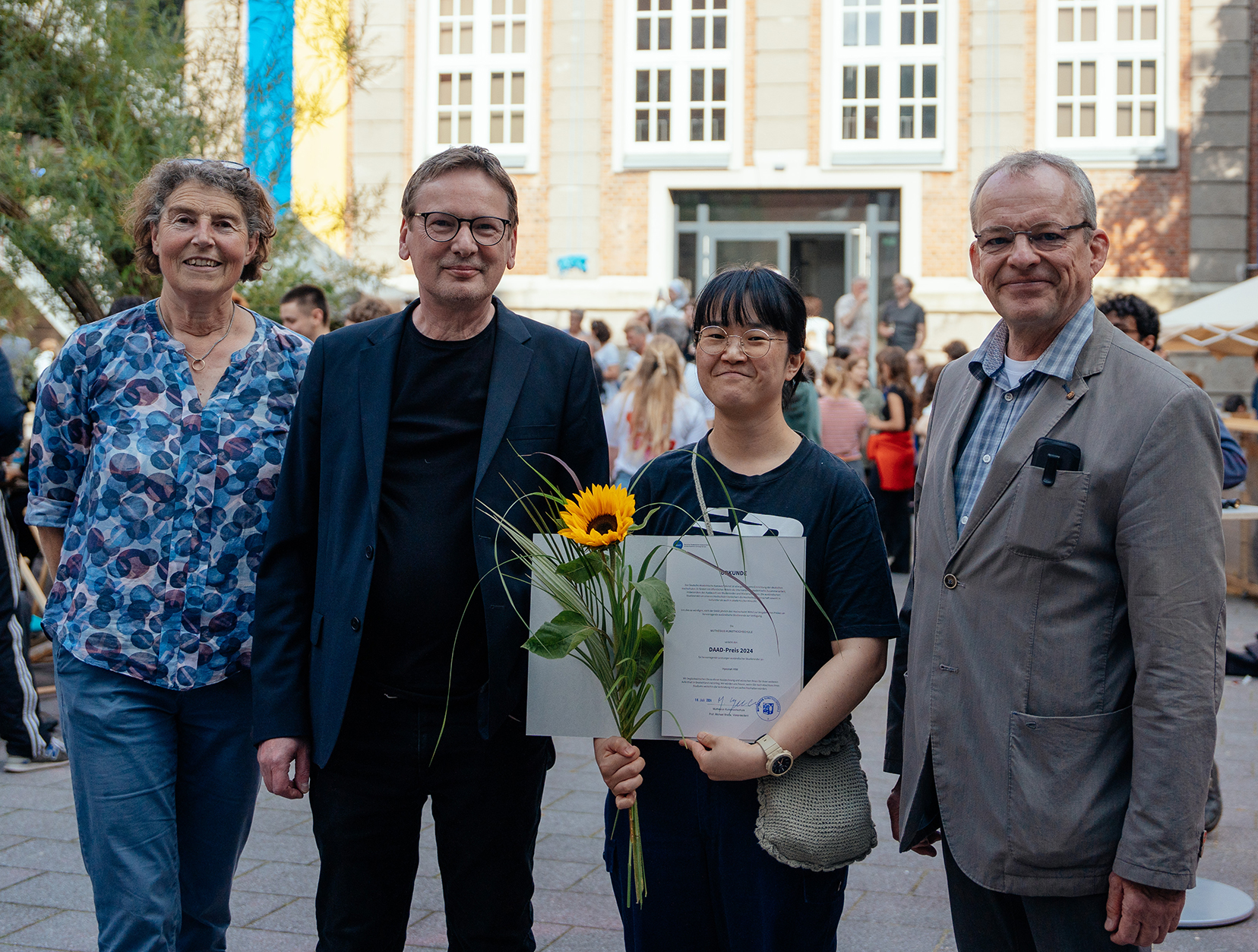 Hyeonah Kim ist mit dem Preis des Deutschen Akademischen Austauschdienstes (DAAD) für hervorragende Leistungen internationaler Studierender an deutschen Hochschulen ausgezeichnet worden. Die Studentin der Illustration im Studiengang Kommunikationsdesign hat die Auszeichnung von Michael Breda, Vizepräsident der Muthesius Kunsthochschule, von Professor Markus Huber und Maud Zieschang vom International Office erhalten. Die mit 1.000 Euro dotierte Anerkennung würdigt neben herausragenden akademischen auch besonders soziale, gesellschaftlich-interkulturelle Leistungen ausländischer Studierender in Deutschland. Überreicht worden ist die Urkunde an Hyeonah Kim während der Eröffnungsfeier der Jahresausstellung „Einblick/Ausblick“ .