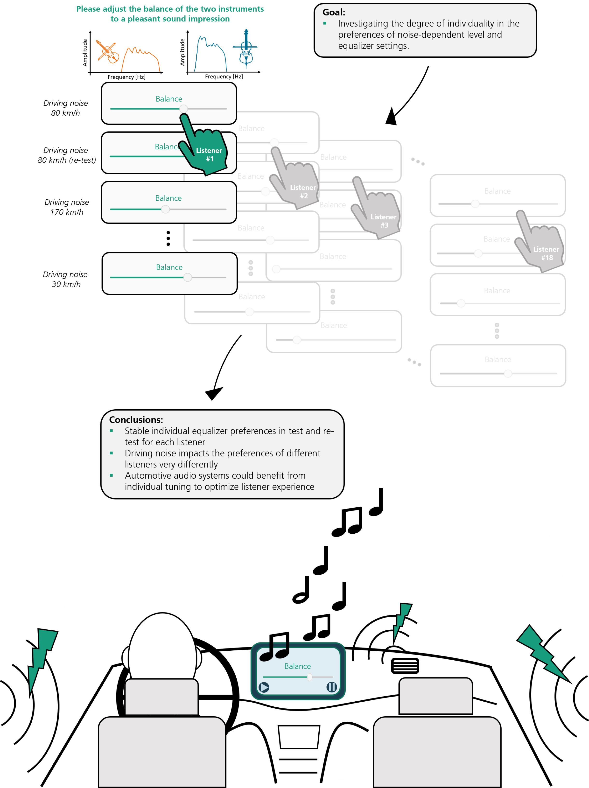 For practical application, a number of findings can be drawn from the results of the study: People have individual hearing preferences in both quiet and noisy driving scenarios. A standardized increase in volume and low frequencies in the presence of background noise cannot therefore satisfy all sound preferences. The good news is that personal sound profiles could be limited to two one-time settings – one for quiet environments and one for scenarios with driving noise.