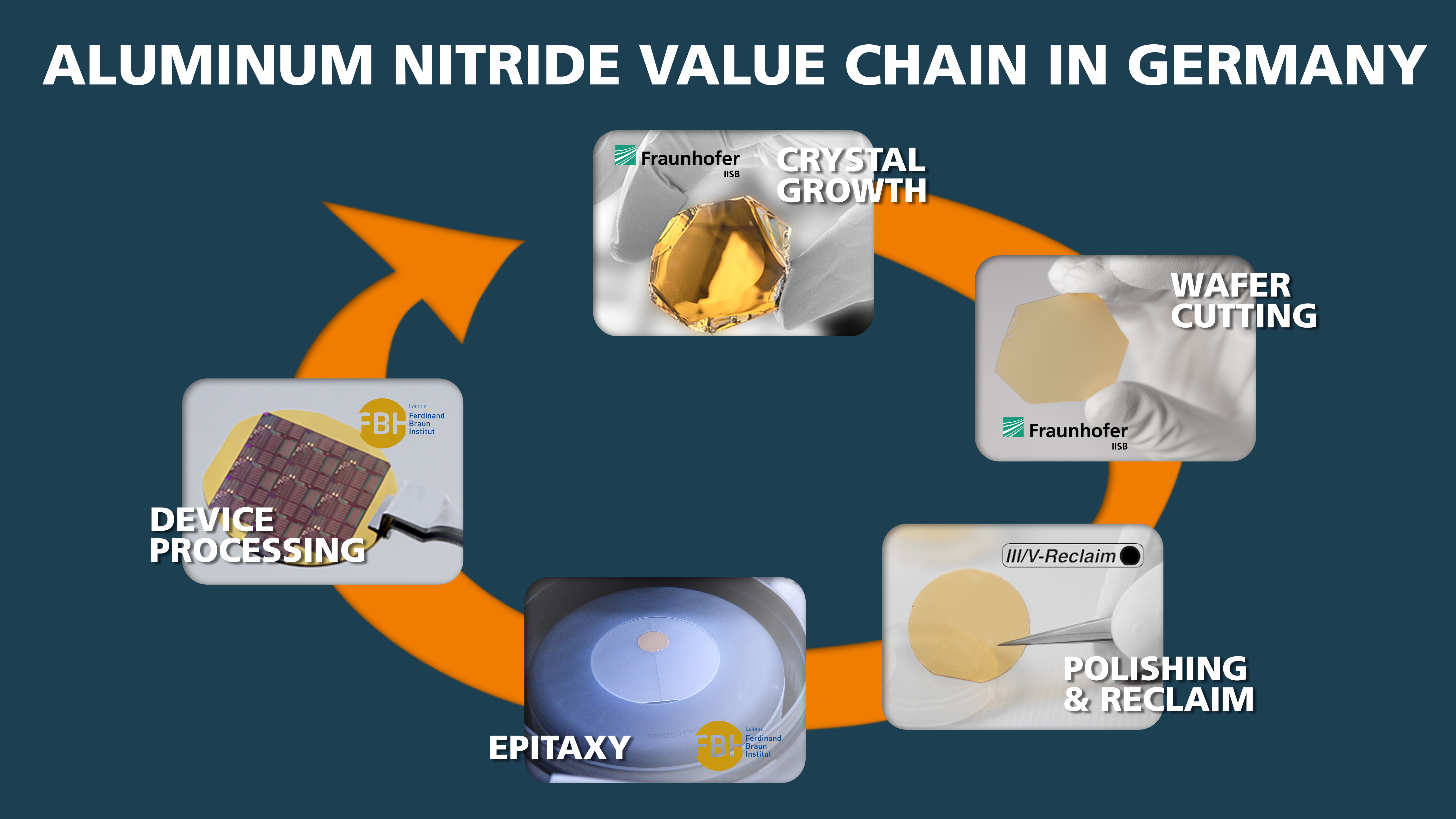 Um die AlN-Technologie mittelfristig für die Industrie zugänglich zu machen, wurden die in Deutschland bereits vorhandenen Aktivitäten zu diesem Material in einem strategischen Cluster gebündelt. Ziel ist es, eine deutsche Wertschöpfungskette für AlN-basierte Technologie zu etablieren und eine internationale Führungsposition in diesem wirtschaftlich immer bedeutsameren Bereich aufzubauen. Das Ferdinand-Braun-Institut, Leibniz-Institut für Höchstfrequenztechnik (FBH), das Fraunhofer-Institut für Integrierte Systeme und Bauelementetechnologie IISB und die Firma III/V-Reclaim PT GmbH treiben diese Aktivitäten gemeinsam voran. Sie decken dabei die gesamte Wertschöpfungskette ab, ausgehend von der Züchtung von AlN-Kristallen mittels Physical-Vapor-Transport-Verfahren (PVT) über das Wafering und Polieren von epitaxiefähigen AlN-Wafern sowie die Epitaxie der funktionalen Bauelement-Schichten bis hin zur Herstellung von Transistoren für Leistungselektronik- und Millimeterwellen-Anwendungen.