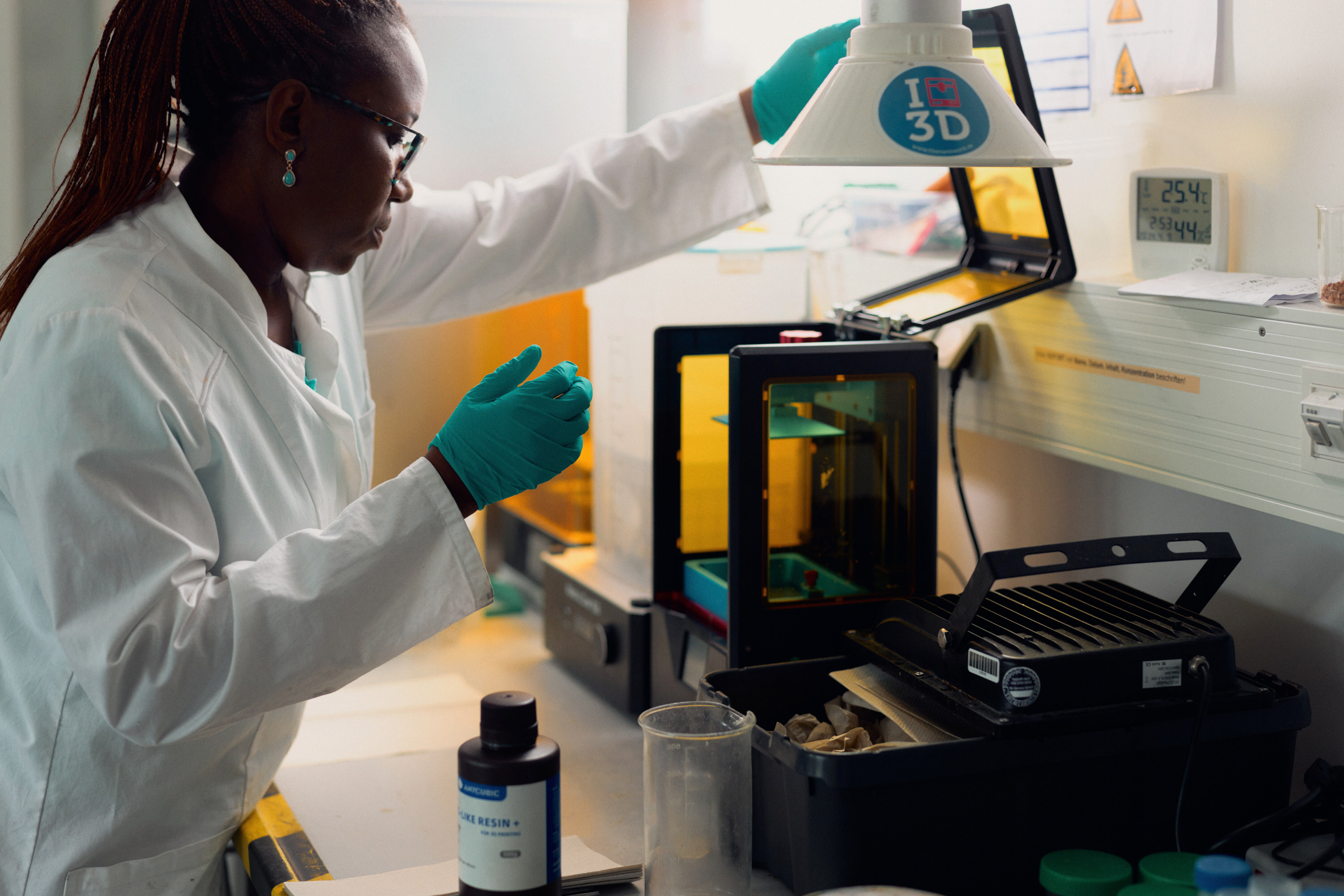 Der 3D-Drucker steht im Labor für Textiltechnologie der Hochschule Bielefeld (HSBI). Dort forscht die aus Simbabwe stammende Nonsikelelo Sheron Mpofu aktuell zur Modifikation von Textiloberflächen mittels 3D-Druck. Gefördert wird ihr Forschungsaufenthalt an der Hochschule durch ein Gleichstellungsstipendium: Neben der Arbeit im Labor will Mpofu daran forschen, wie sich der Anteil von Frauen in naturwissenschaftlichen Studiengängen steigern lässt.