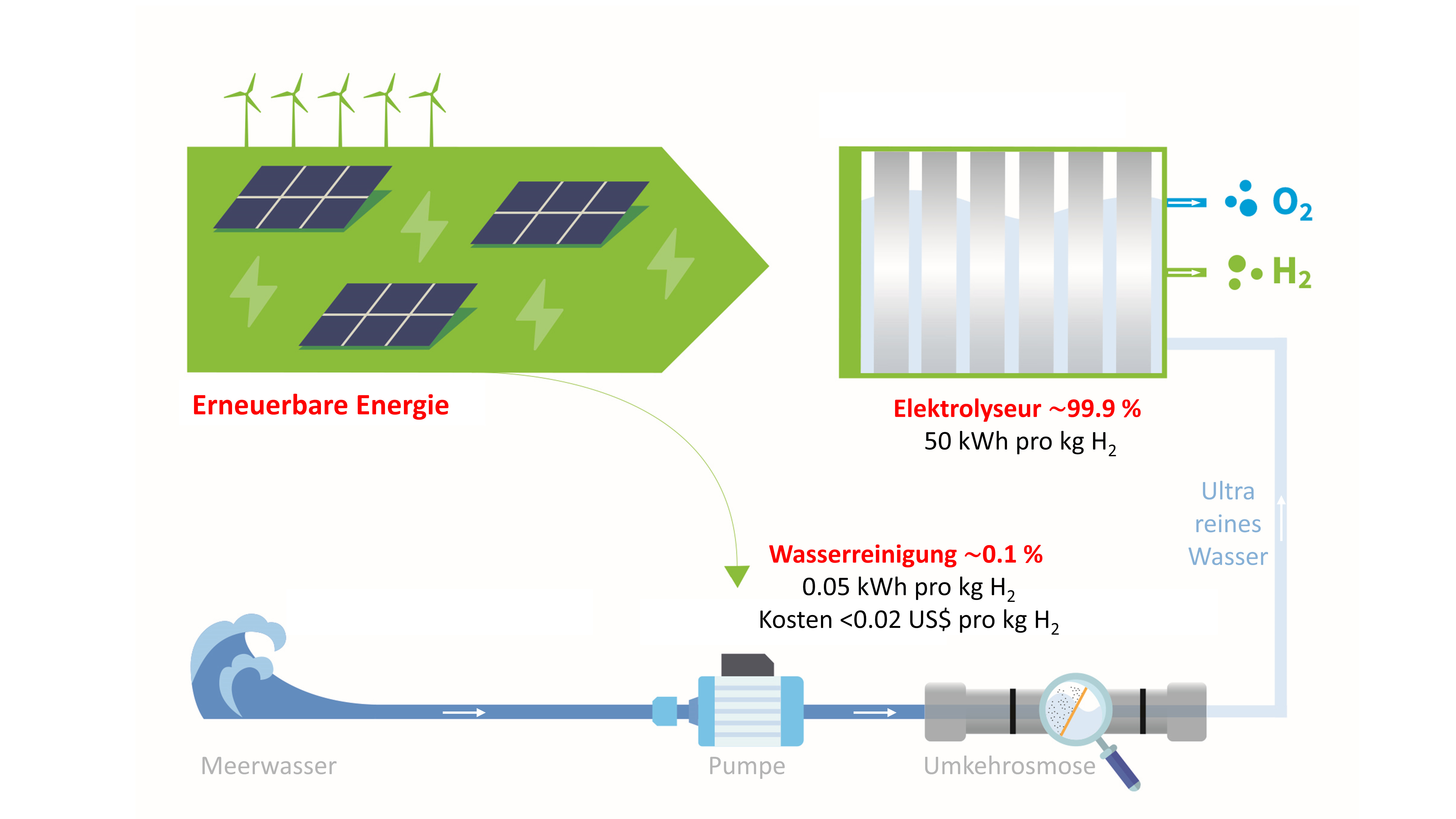 • Kommerziell bereits erhältliche Wasseraufbereitung wie Umkehrosmose bereitet Meerwasser so auf, dass es für „normale“ Elektrolyseure geeignet ist. Die relativen Kosten dafür sind sehr gering.