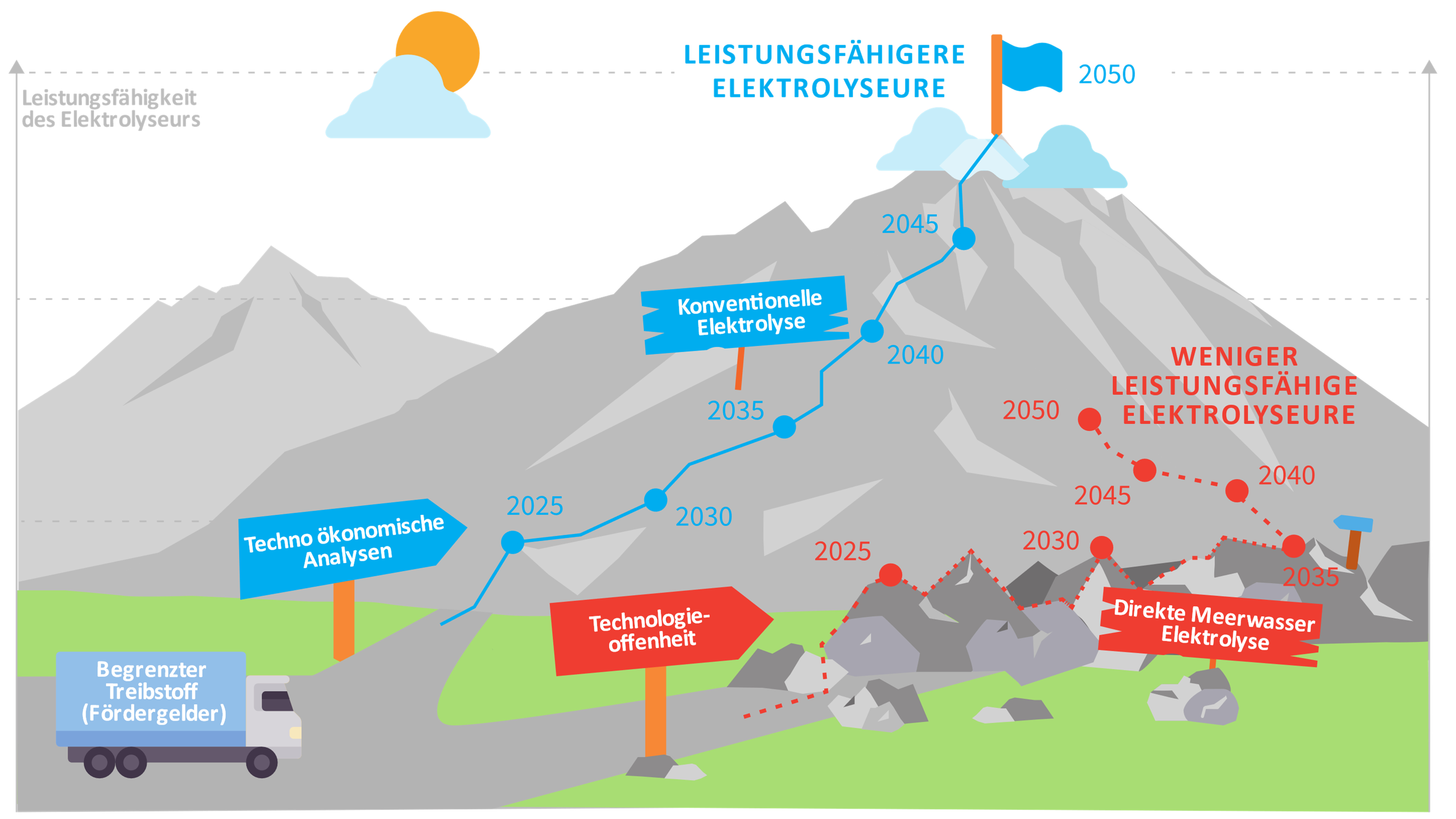 • Direkte Meerwasserelektrolyse bringt für die zu entwickelnden Elektrolyseure große Herausforderungen: